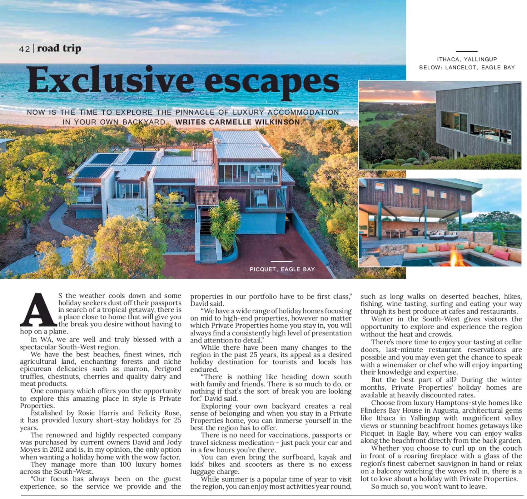 That’s where Private Properties, a luxury holiday homes reservation service, comes in. With over 100 stunning examples of architectural works of art in their repertoire, there’s no doubt you’ll find a jaw-dropping home to host your WA getaway.