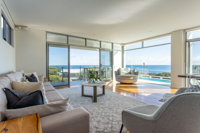 Outside, Bilyarra’s wrap-around balcony always reminds guests of what’s right in front of them – one of the most beautiful ocean vistas around – which can also be enjoyed from multiple outdoor entertaining areas. Then, there’s the pool: a cool vantage point in which to soak in vibrant blue hues.