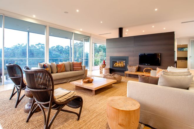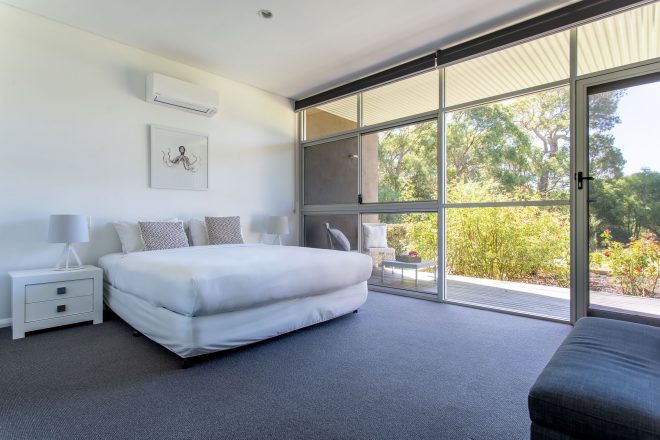 In warmer months, the main living area can be air-conditioned, however it’s easy to welcome the sea breezes into the home via double doors that open out to the pool and deck area. In winter, an enclosed French wood fire adds a cosy charm, though guests have the option of the convenient reverse cycle air-conditioning.