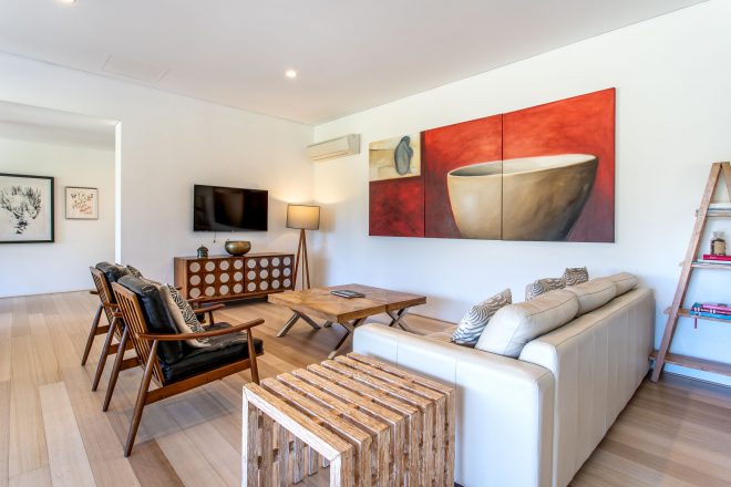 Adjacent to this main entertaining area is a comfortable TV room, with a large day-bed looking out to the ocean and pool area – a perfect spot for reading or just relaxing.  Nearby, the guest bedroom wing features a king bedroom, two bedrooms each with two king single beds, and a guest bathroom.