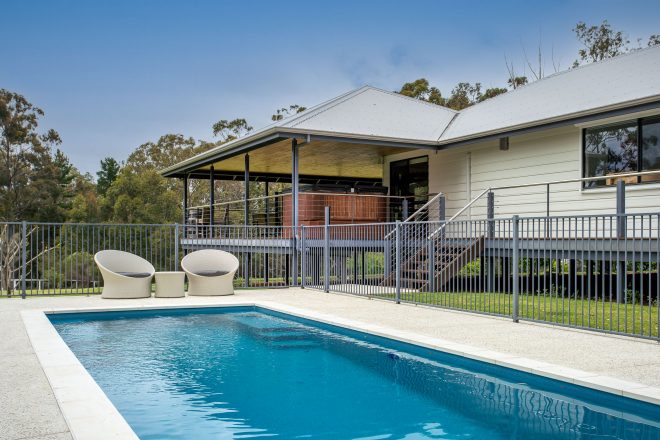 Modern country interiors complement Marribrae’s surroundings – eight acres comprising towering trees, a private dam, a mini orchard and manicured green grass – which you can appreciate from nearly almost every room (including from the spa bath in the master ensuite), the home’s outdoor alfresco and resort-style swimming pool.