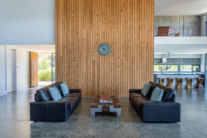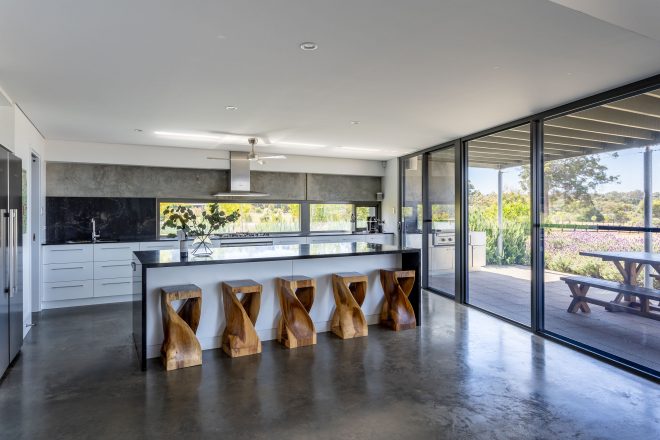 Lots of wood and charcoal tones also means this non-traditional beach abode fits perfectly into its surroundings; across the road from the beach in Dunsborough with views over Toby Inlet at the back. It’s unique name, 82 Degrees comes from the most prominent angle in the house.