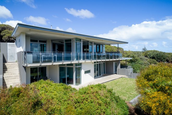 The main living area is on the upper level, maximizing the views with floor to ceiling windows right across the front of the house, with a protected alfresco area for outdoor dining.