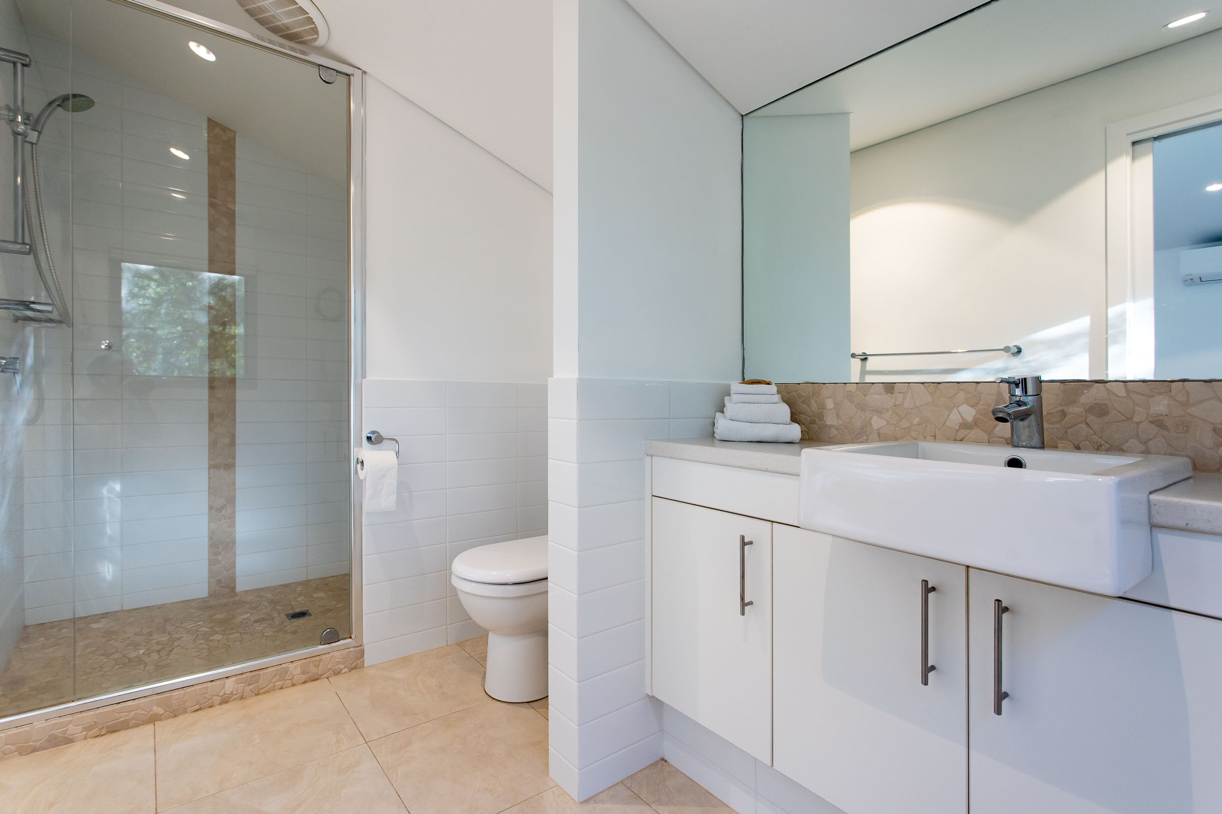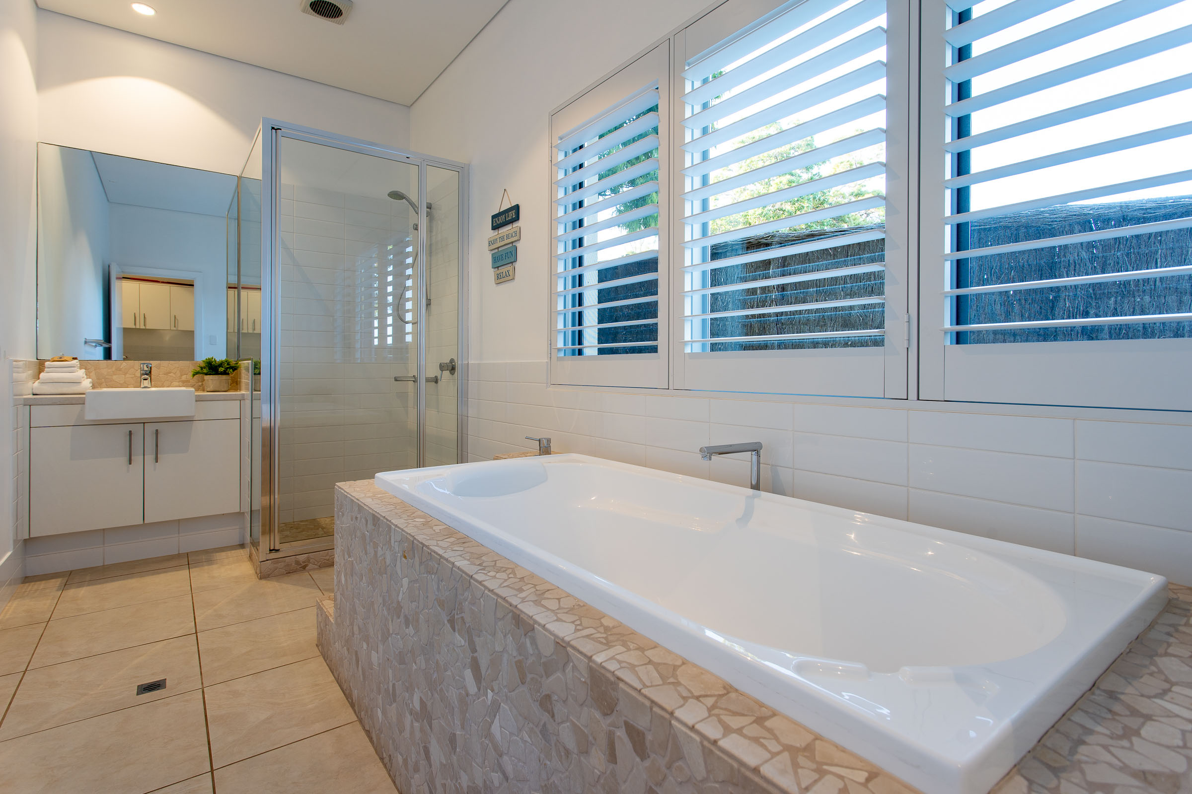 It’s all the above, wrapped up into a bright modern package in old Dunsborough. With a soothing colour palette of oatmeal, crisp white, shades of seaside blues, and a pop of green, you’ll feel a certain sense of rejuvenation that lingers long after you’ve returned home.
