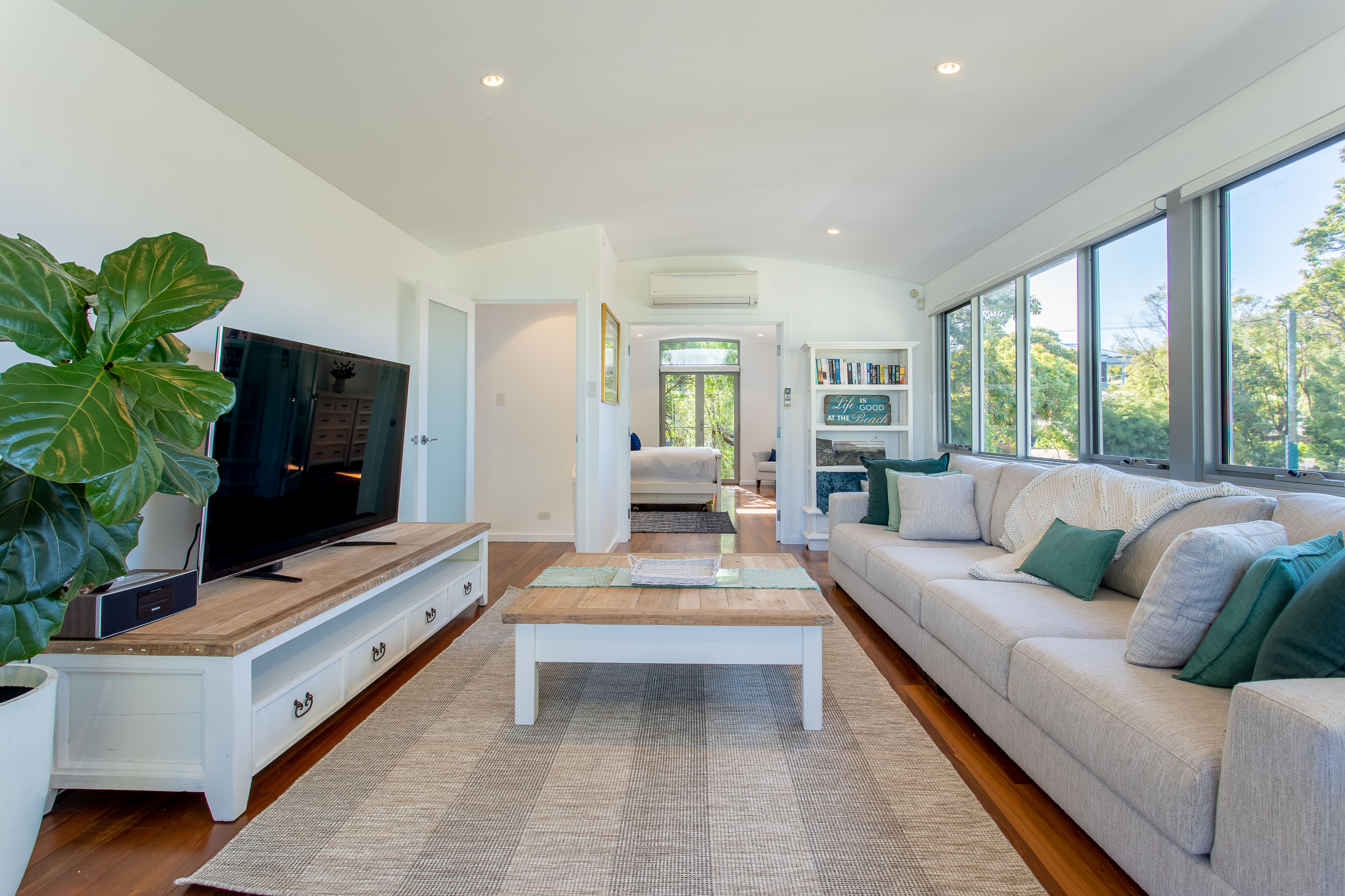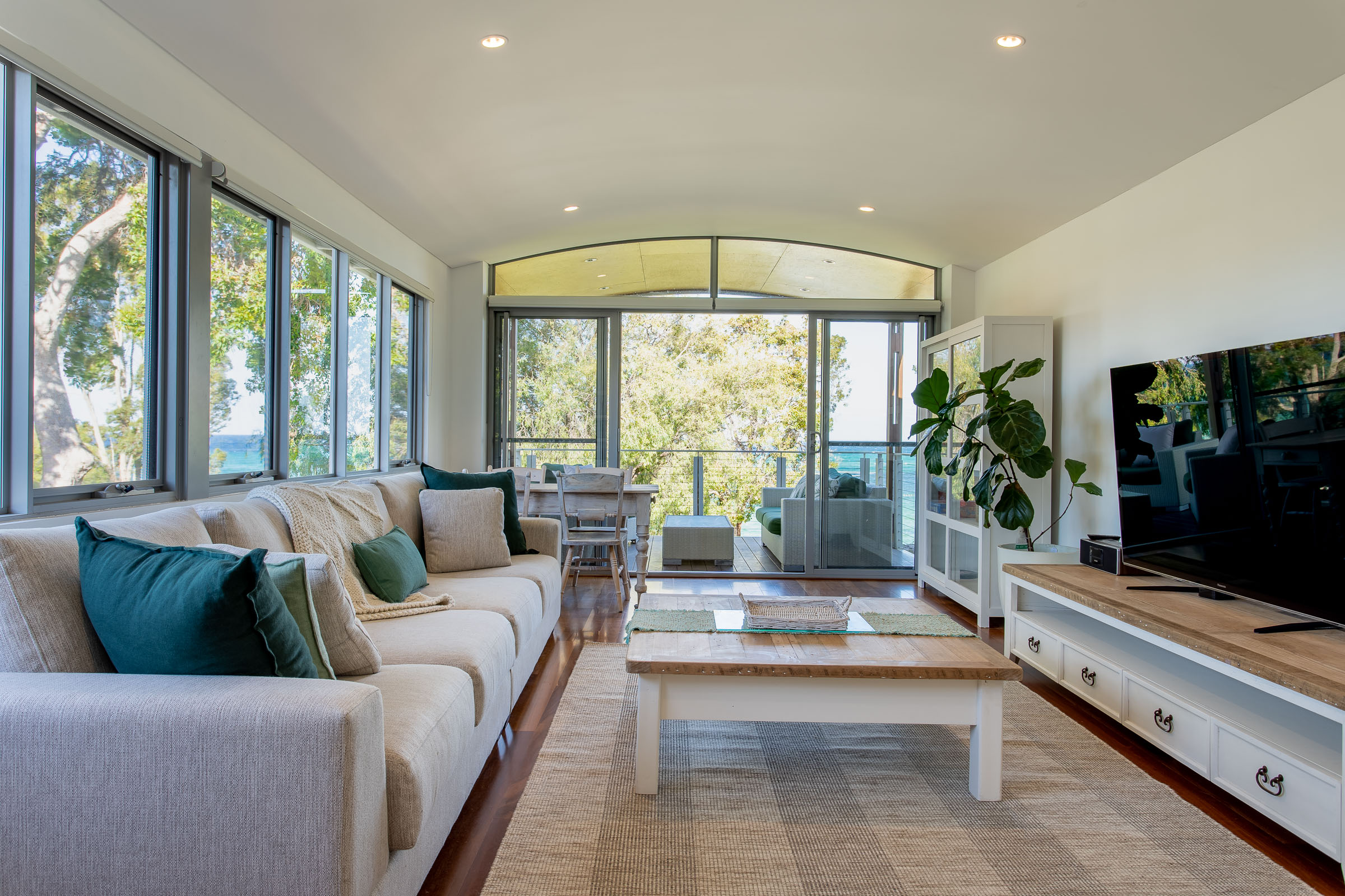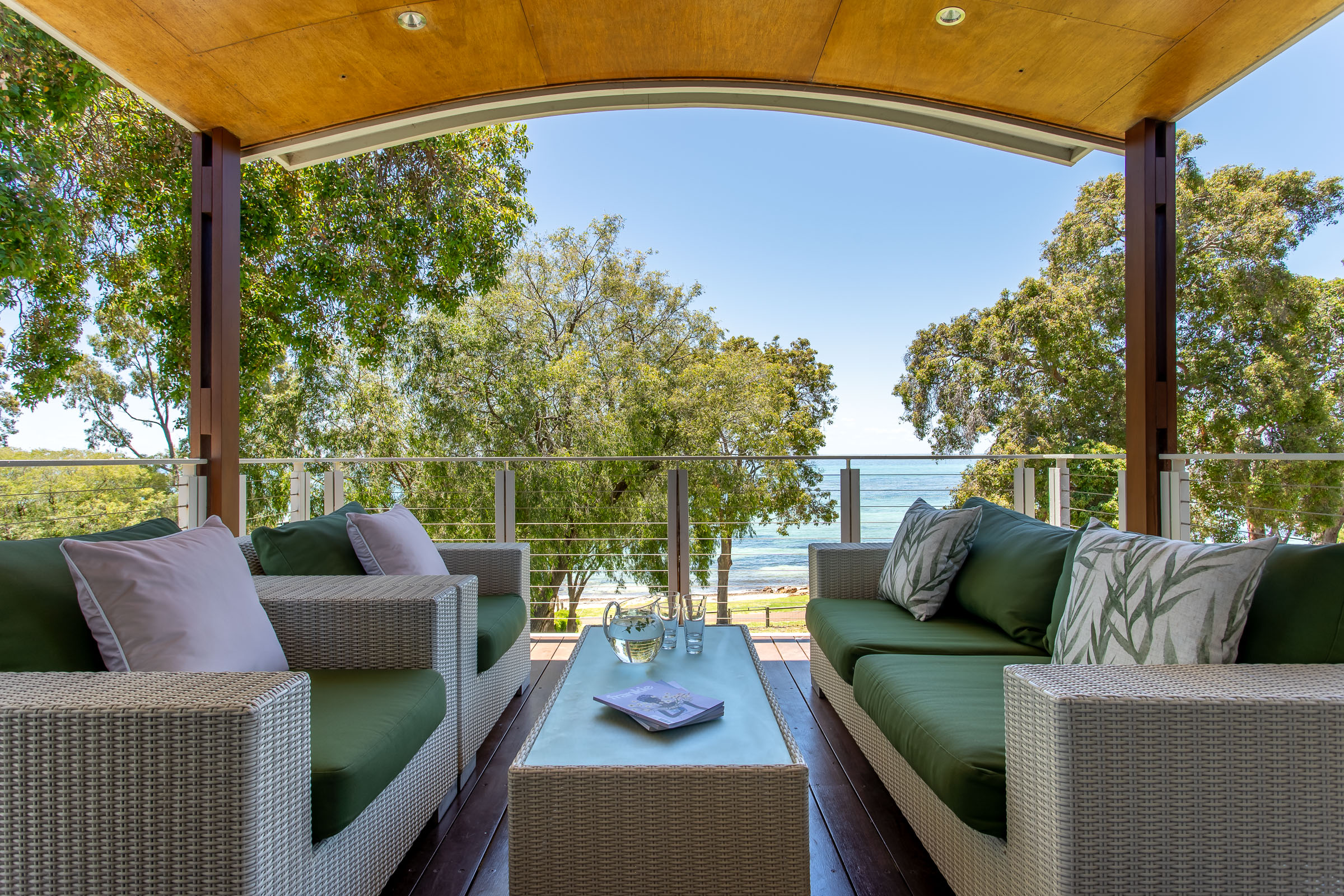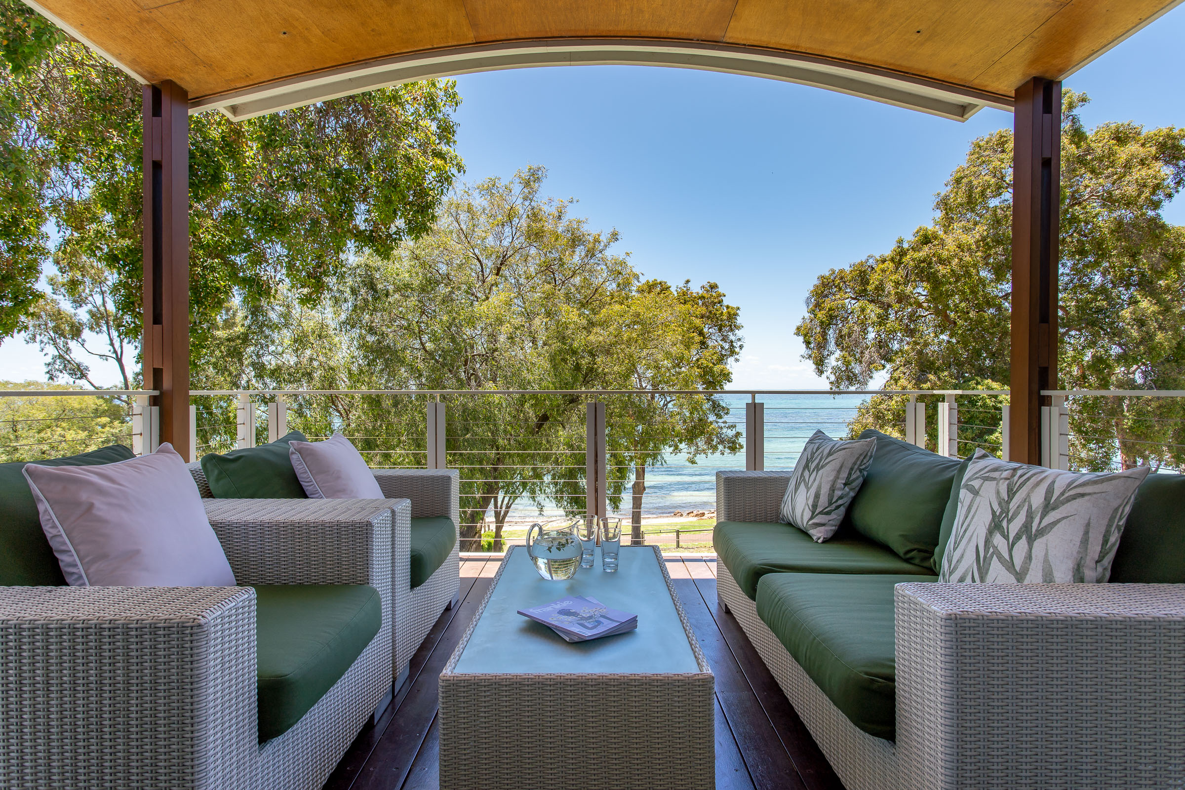 It doesn’t take long for the sigh of holiday happiness to wash over. Is it the beautiful azure bay and golden sand quite literally a stone’s throw away? Or could it be the gentle sway of the peppermint trees creating dancing shadows across the grass?