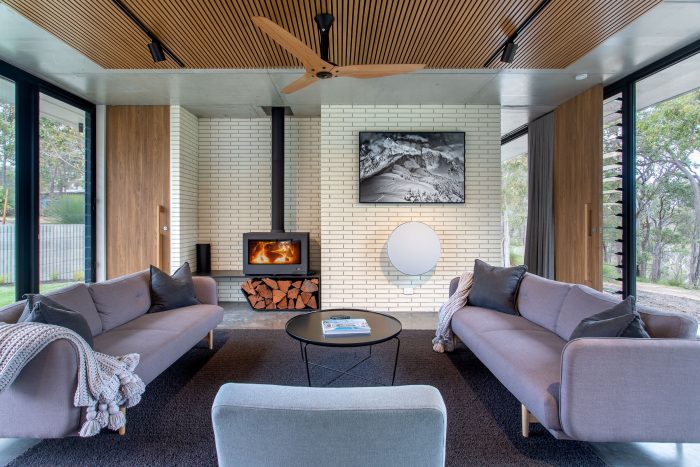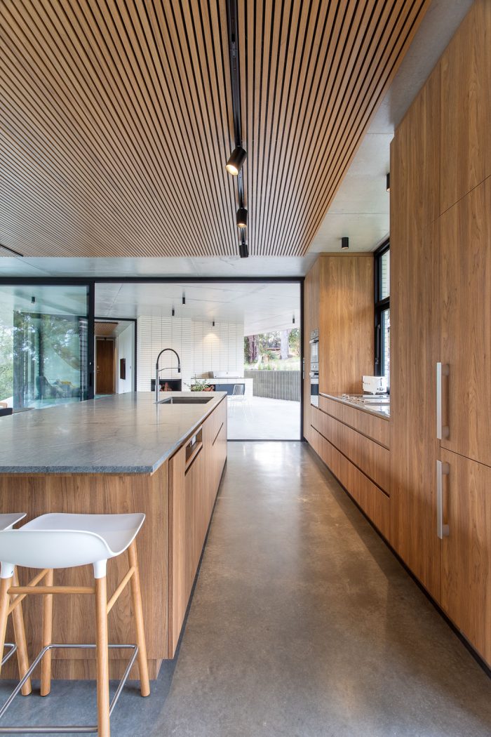 Floor to ceiling double glazed glass windows and doors separate the polished concrete floors and concrete ceiling with it’s acoustic timber panelling.