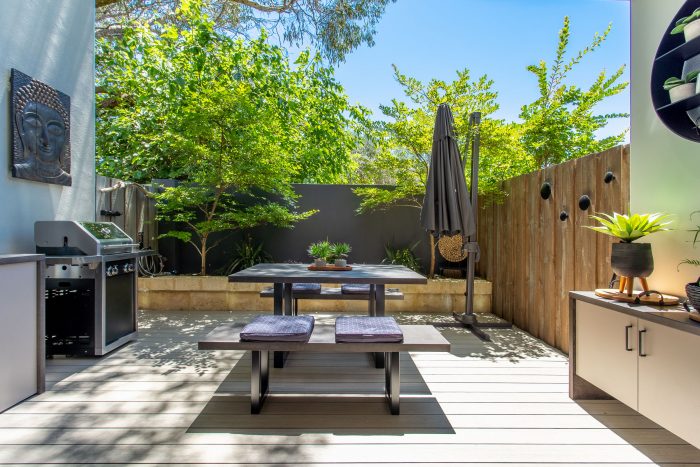 The bathroom, laundry and bedroom are located off a hallway near the entrance, and the open-plan kitchen, dining and living room overlook the beautifully appointed courtyard and alfresco area.
