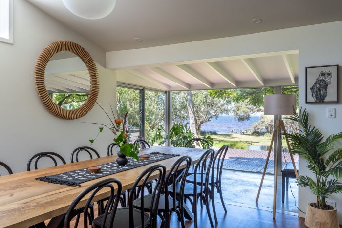 An outdoor deck lines the entire inlet side of the home, the perfect vantage point for soaking in river and tree views and/or keeping a watchful eye on the kids as they play on the property’s long stretch of lawn. A beautiful Wisteria tree and floor-to-ceiling glass panelling frame the tranquil inlet from inside the home’s open-plan living room, a cosy space made up of two sitting areas, a fireplace, dining room and kitchen, while the beautiful scenery can also be glimpsed from the bedrooms and the ensuite too.