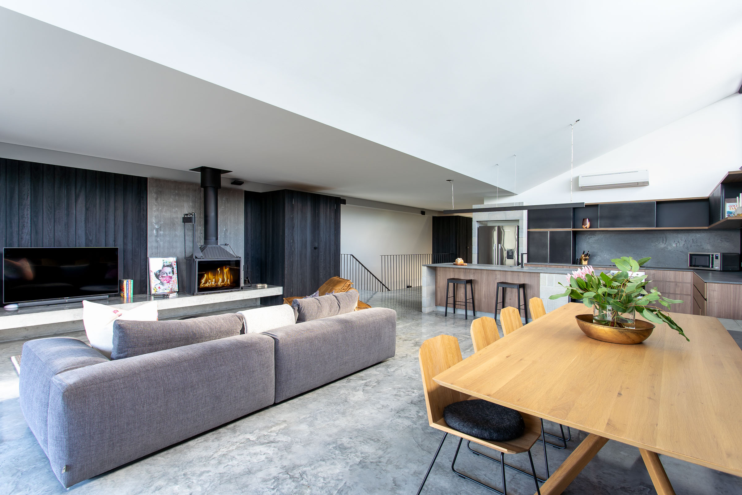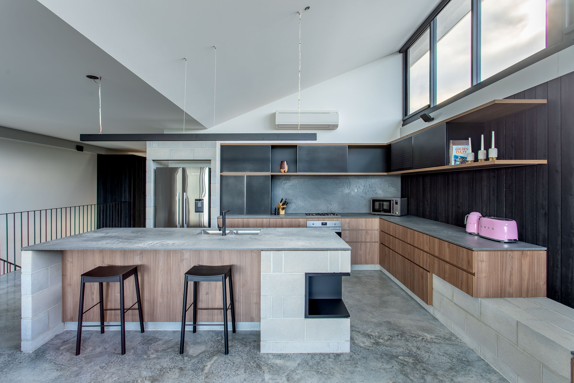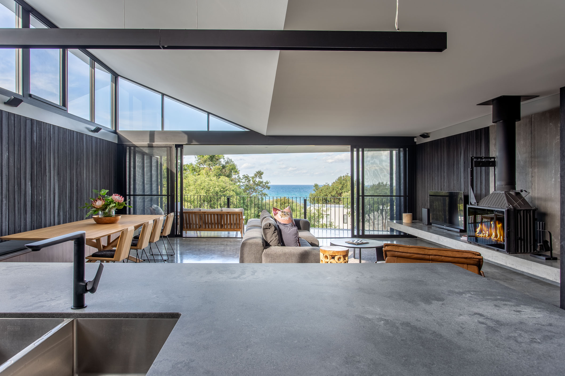 Also on this level is the open plan kitchen, dining and living space, and balcony with dazzling views across Geographe Bay to Busselton. The magnificent pitched angular windows bathe the entire living space in golden afternoon sunlight. Relax on the sofa with your feet toasty by the woodfire, gazing out at the dusty pink sky as the sun rises over the bay.