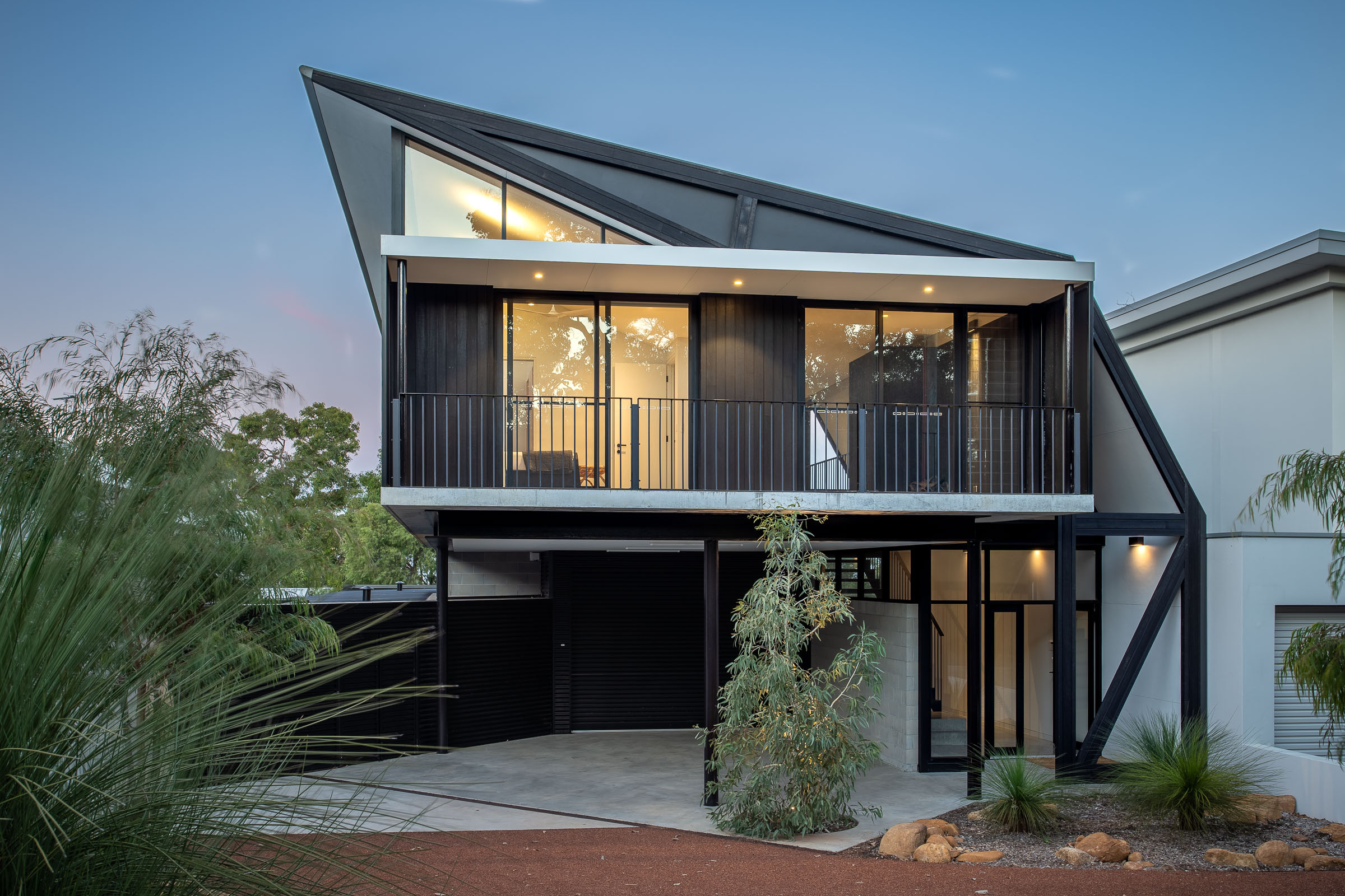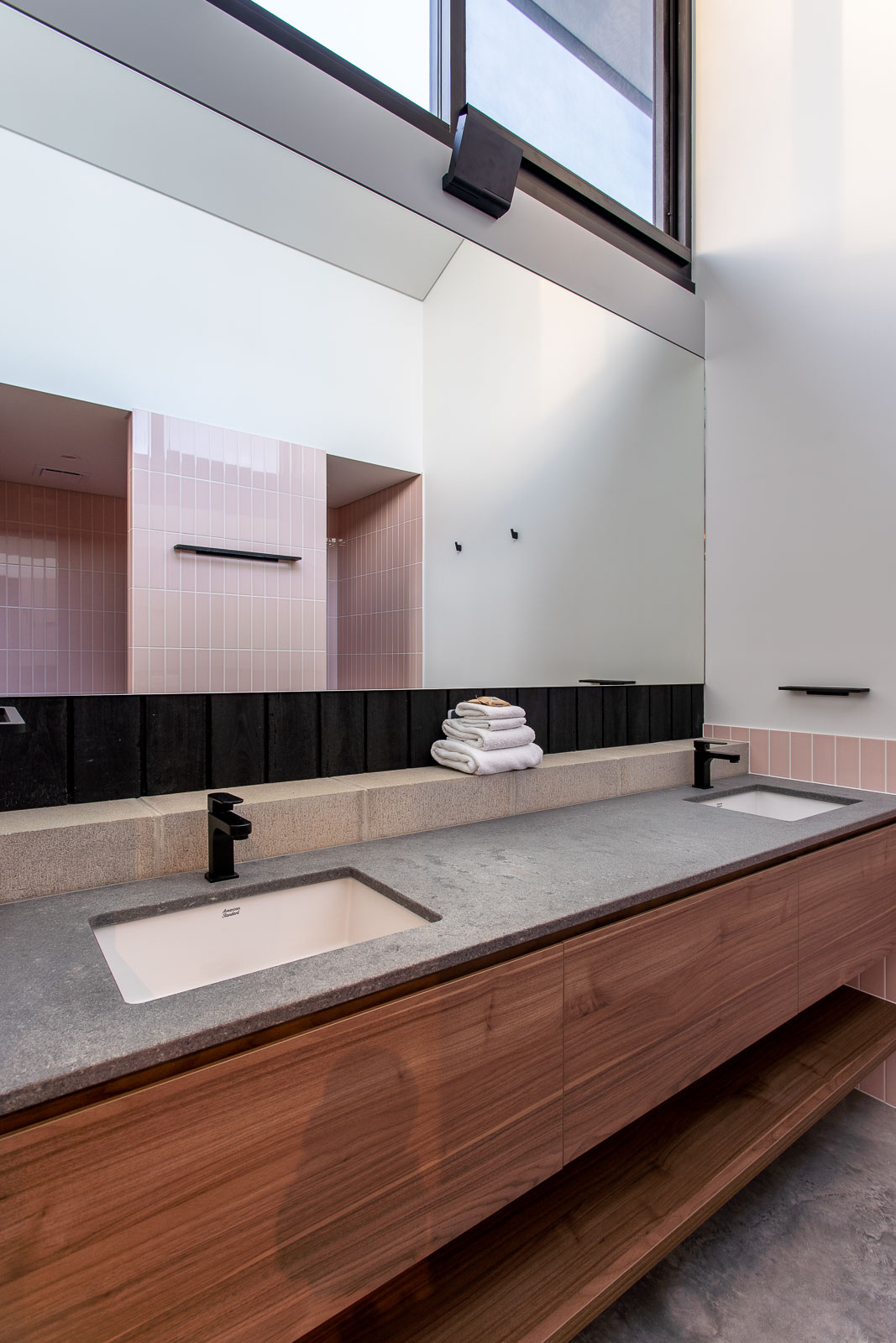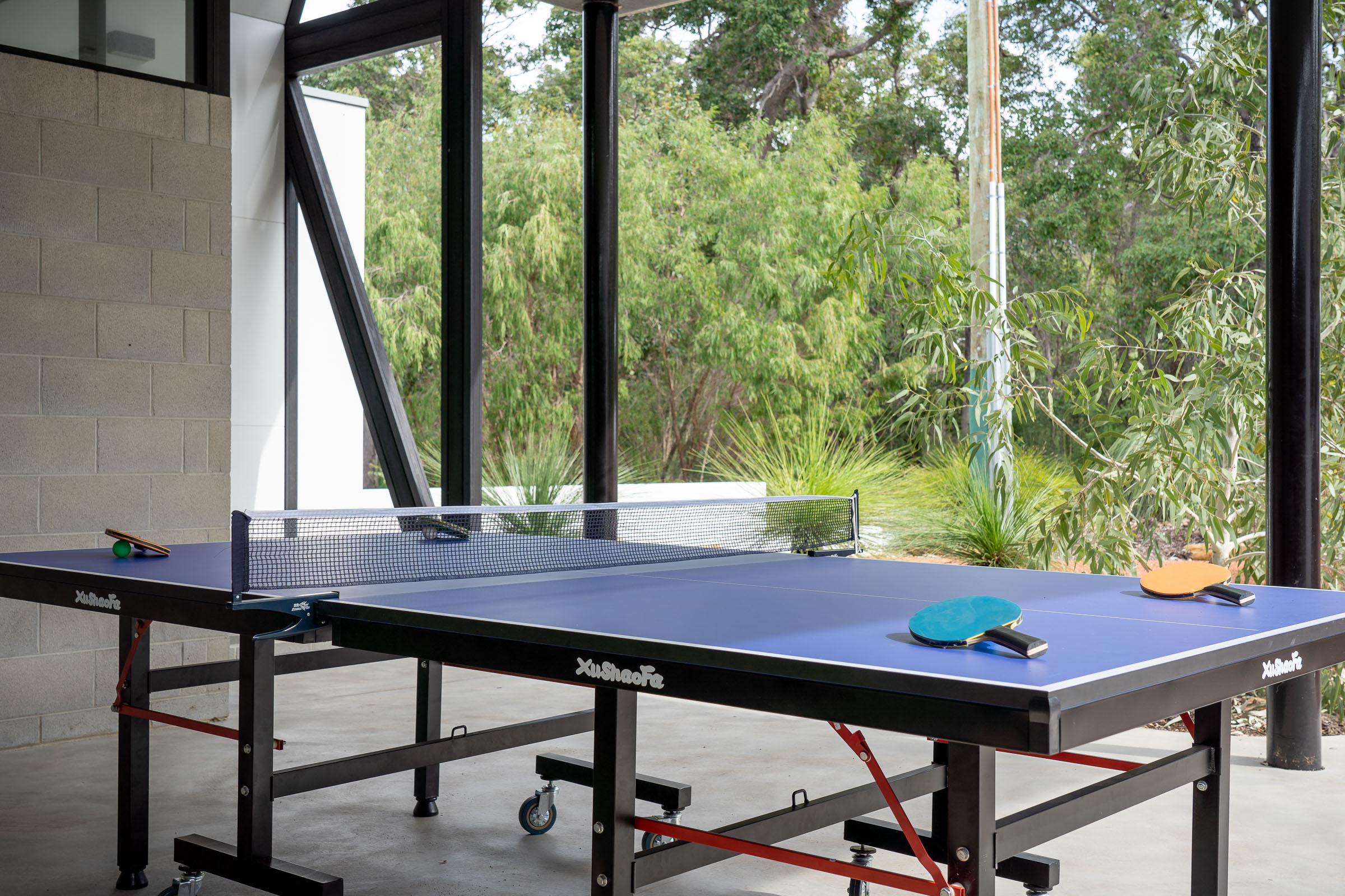 Also on this level is the open plan kitchen, dining and living space, and balcony with dazzling views across Geographe Bay to Busselton. The magnificent pitched angular windows bathe the entire living space in golden afternoon sunlight. Relax on the sofa with your feet toasty by the woodfire, gazing out at the dusty pink sky as the sun rises over the bay.