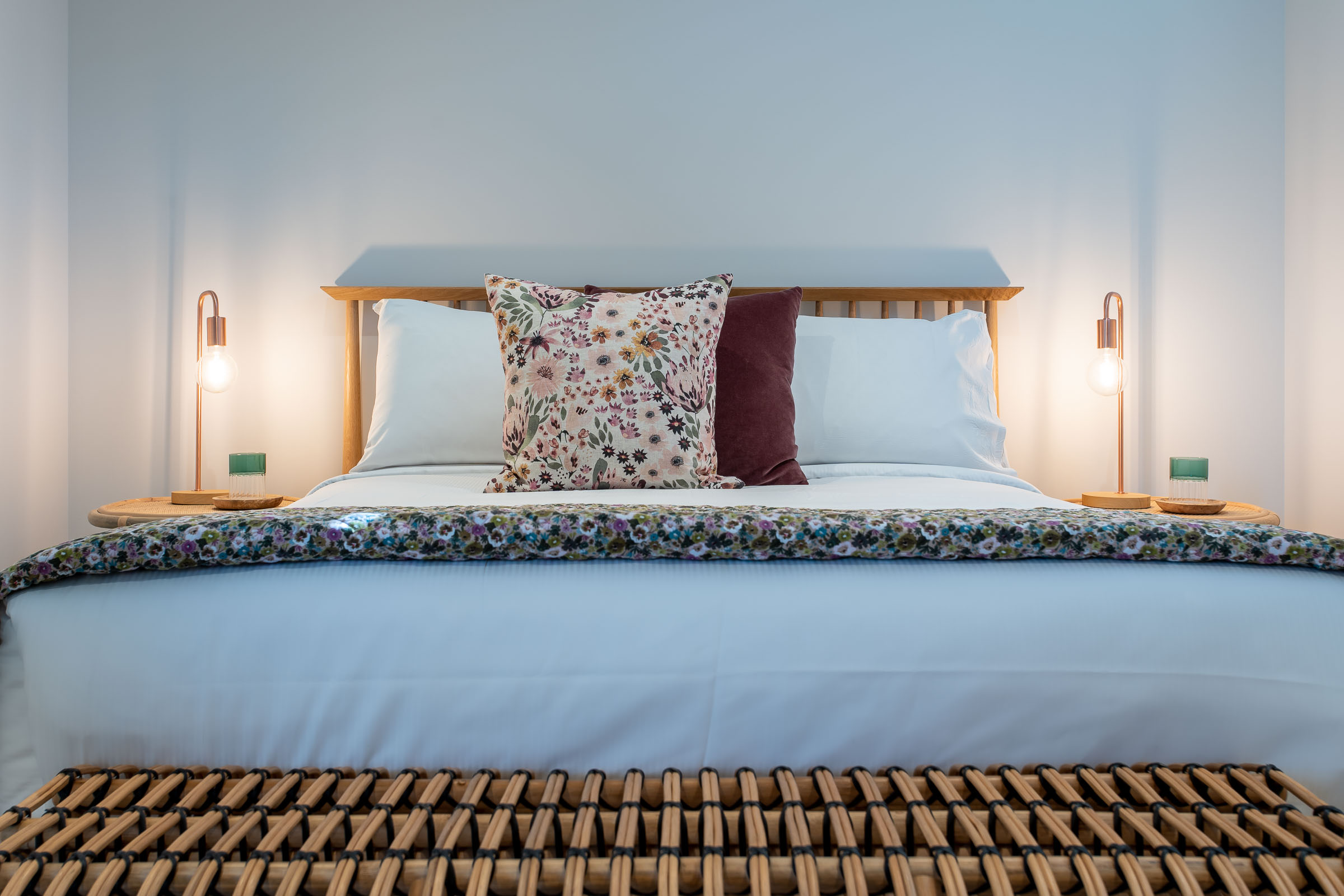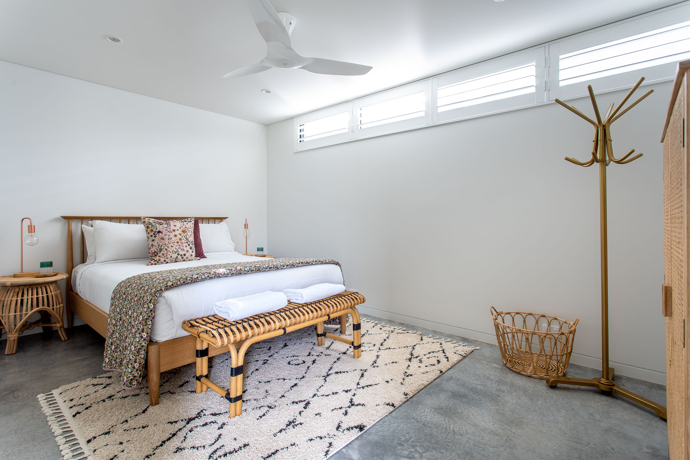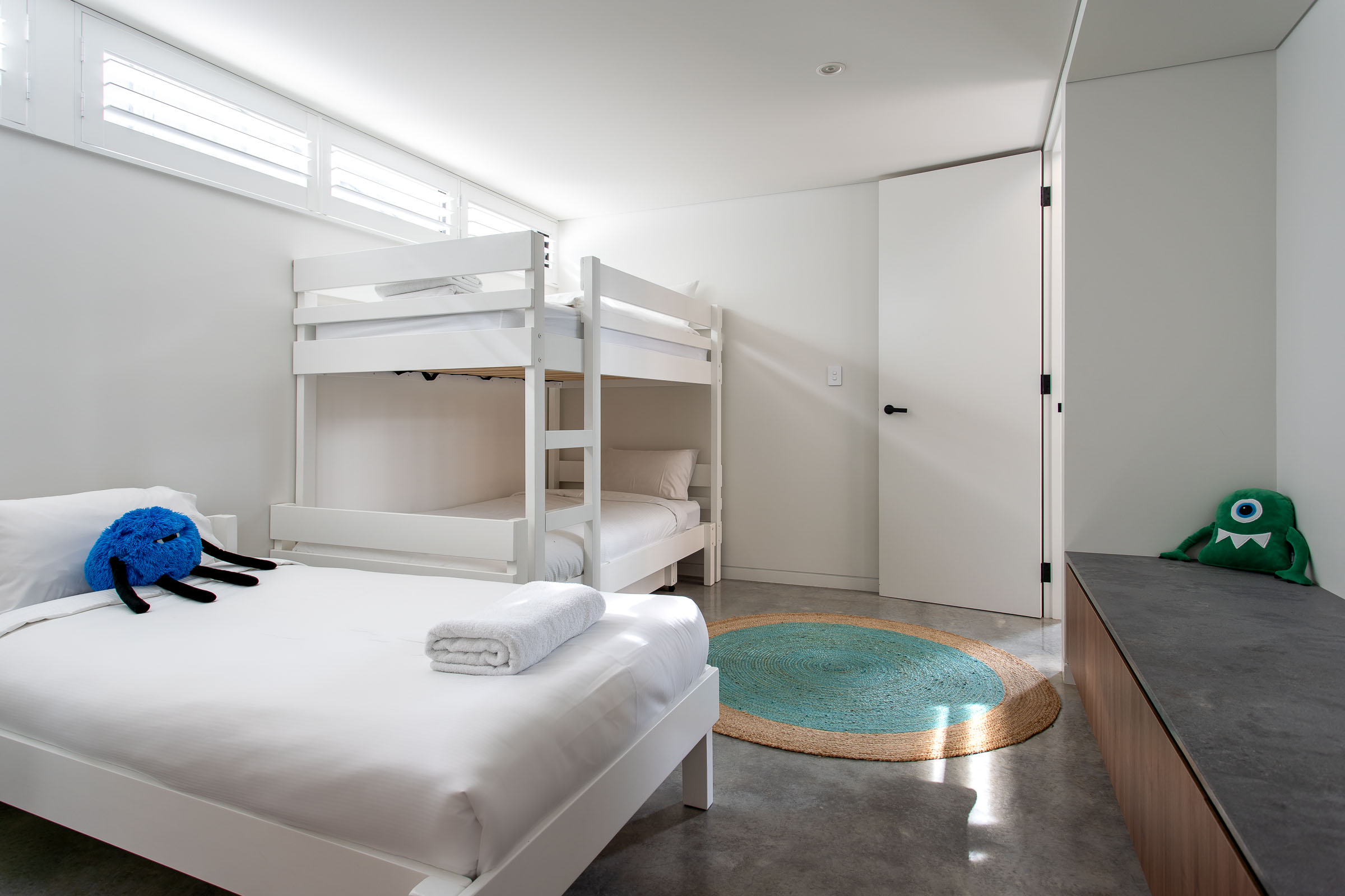 The downstairs living area is equally spacious and features a large screen TV, a colourful lounge, and rustic faded rugs. Each décor piece feels unique and carefully hand-selected. This room flows seamlessly onto the alfresco deck, with the BBQ and lawn area beyond. The two additional queen bedrooms and kids’ bunk room, plus two bathrooms and the laundry are on this level.