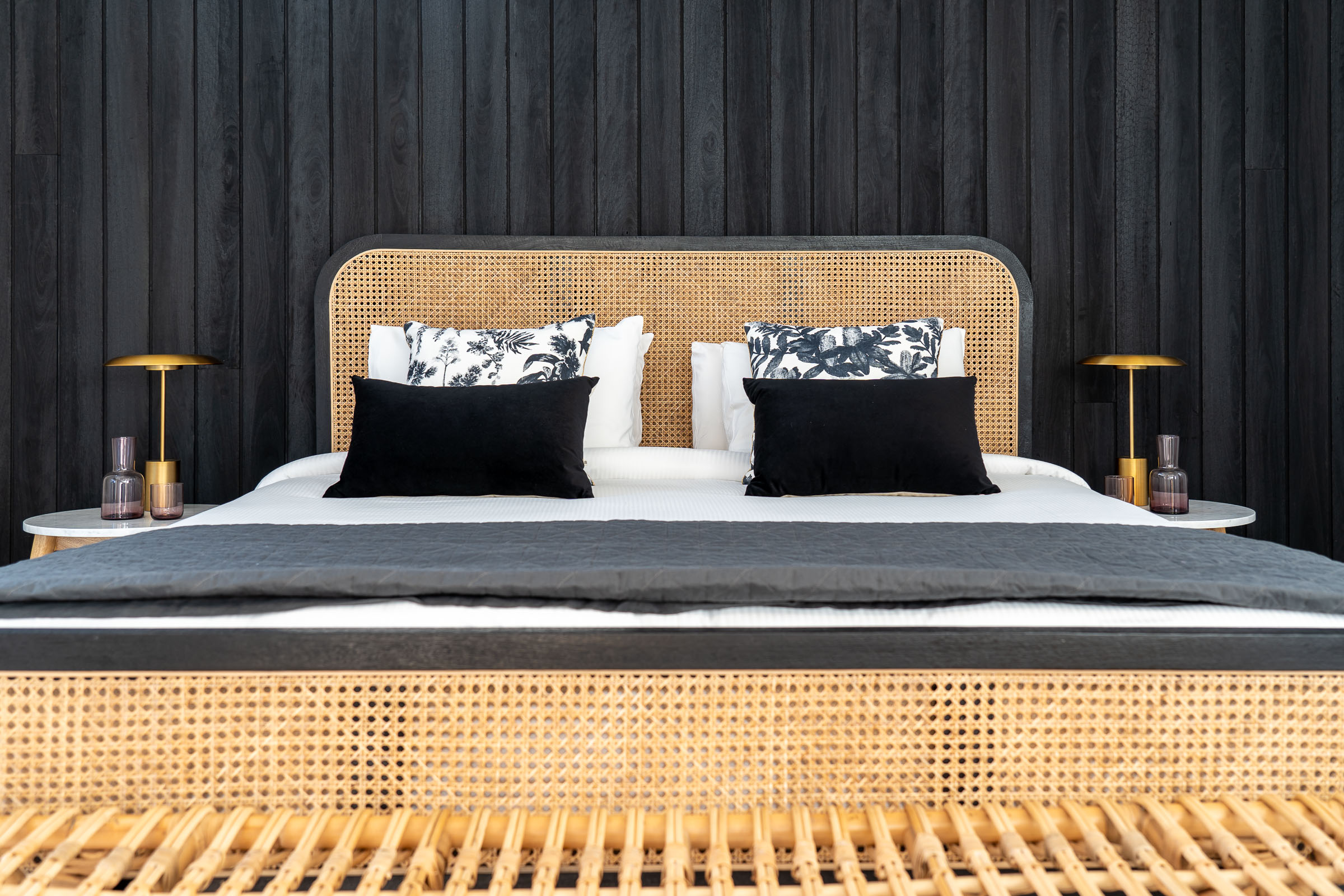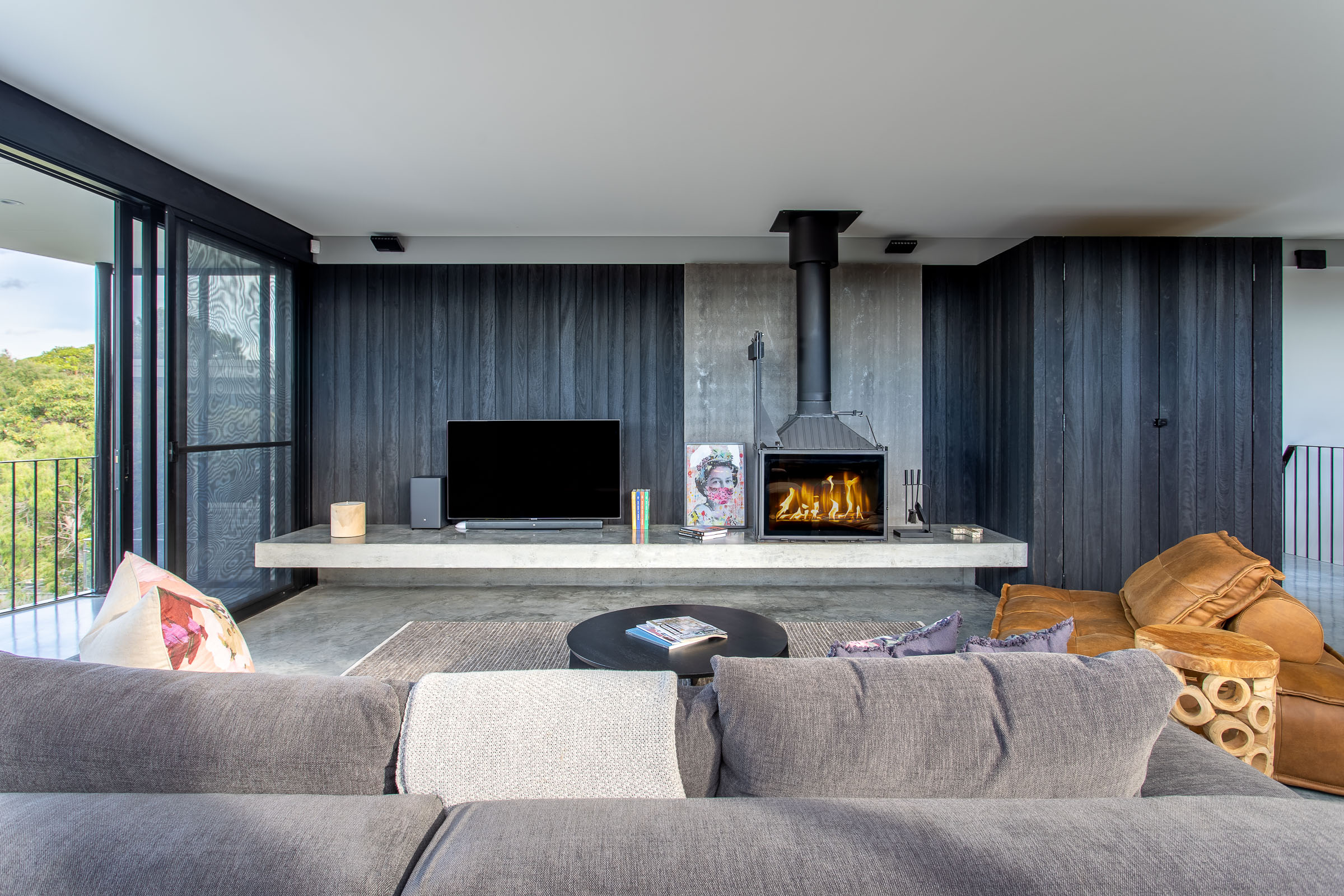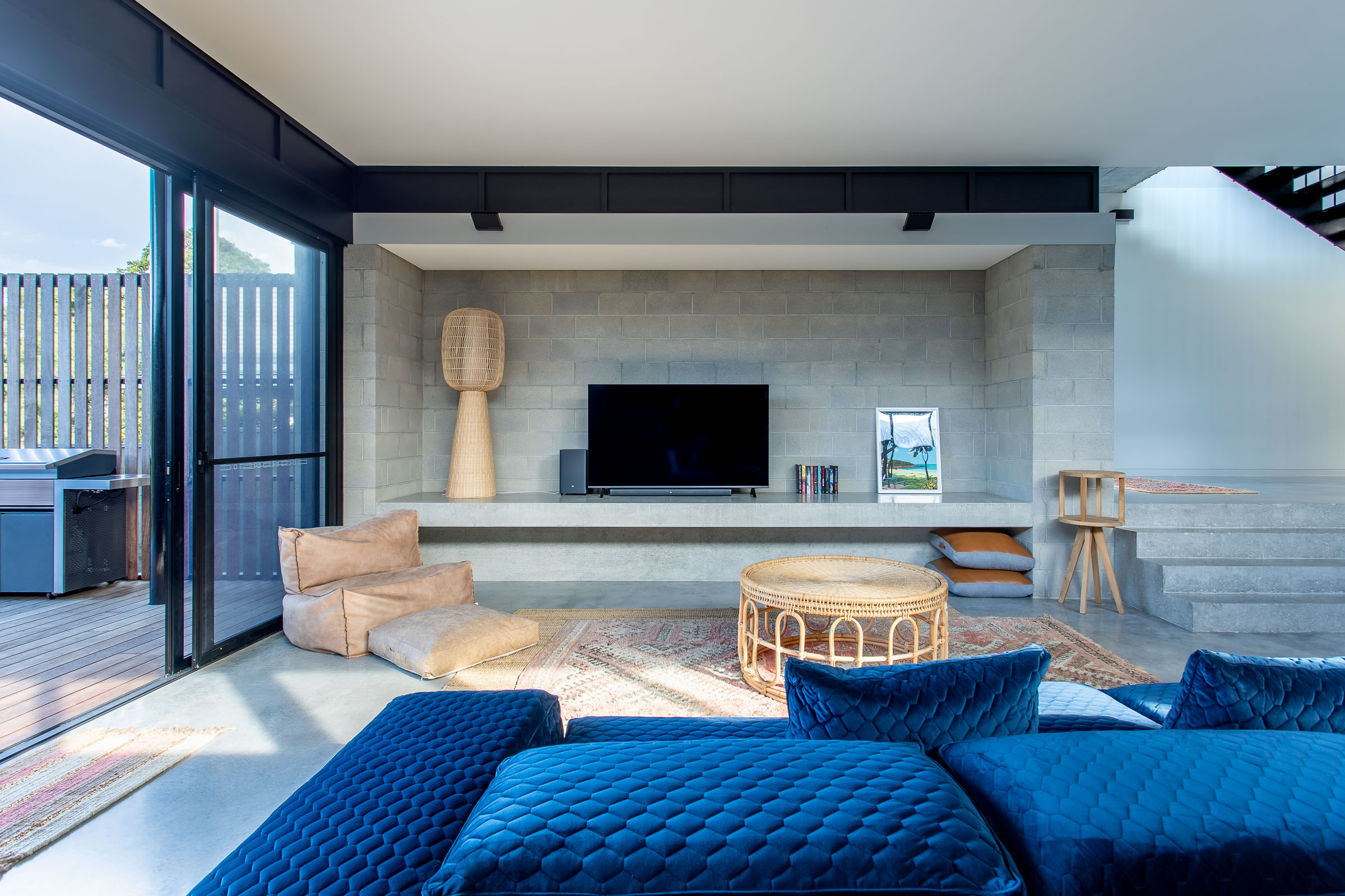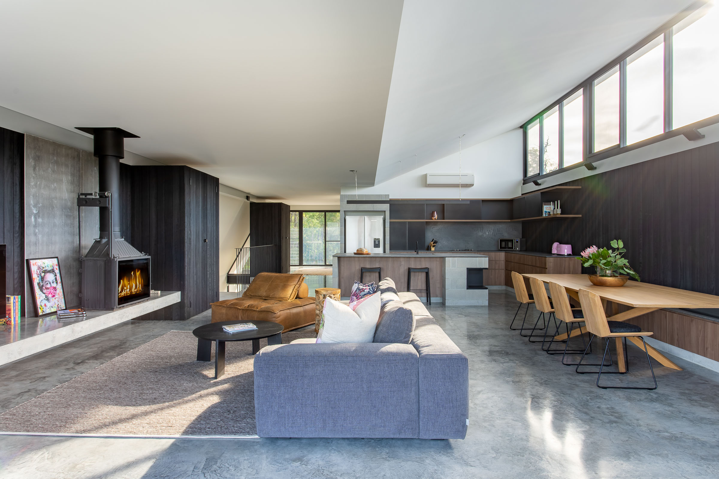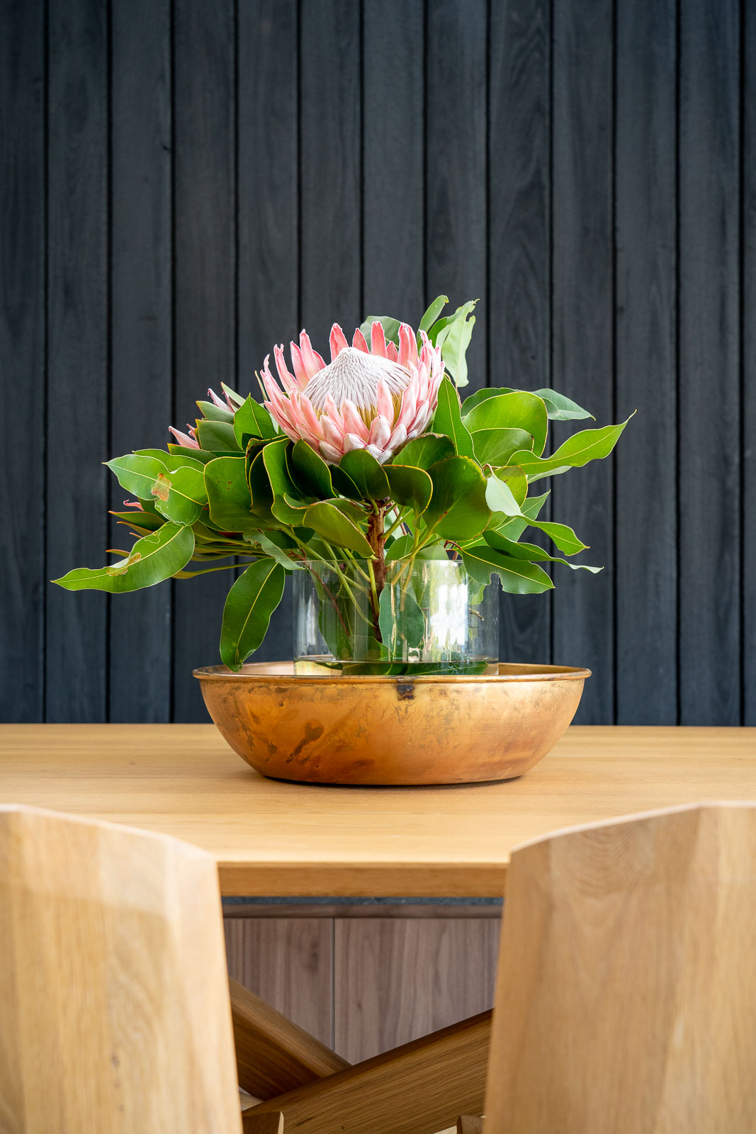 The interiors of this multi award-winning home feature stunning charred timber on the walls – a nod to the surrounding environment – polished concrete flooring, and oodles of space. There’s a certain vintage vibe too with an oversized tan leather lounger and cobalt blue velour sofa, and the eclectic art and décor which adds fire to the soul of Forest Beach House.
