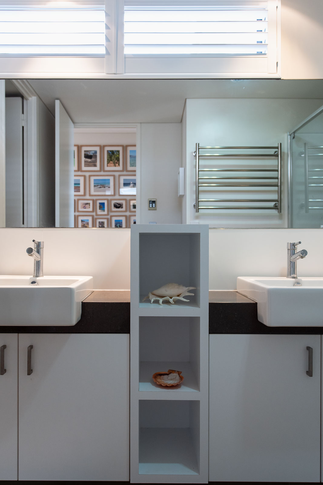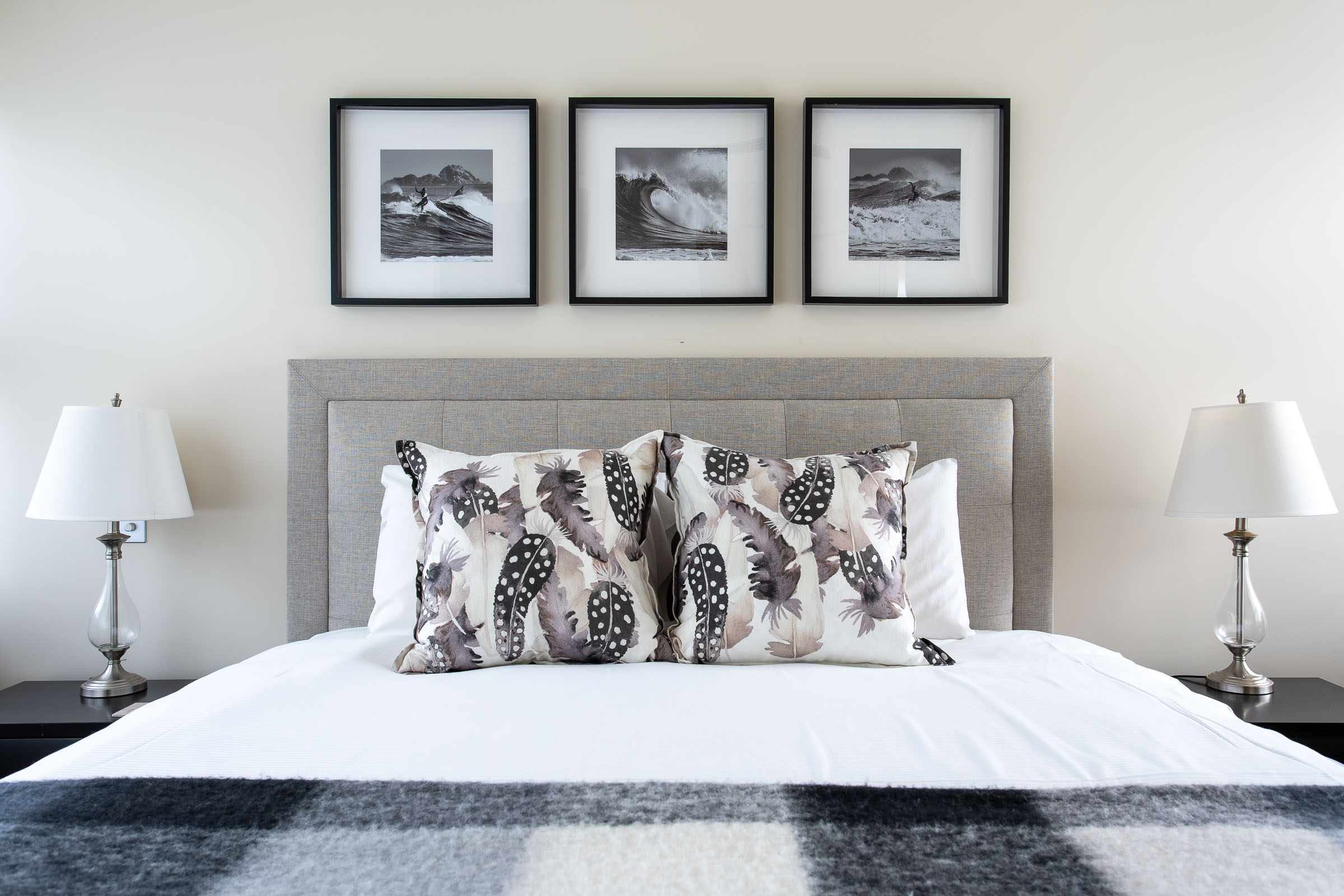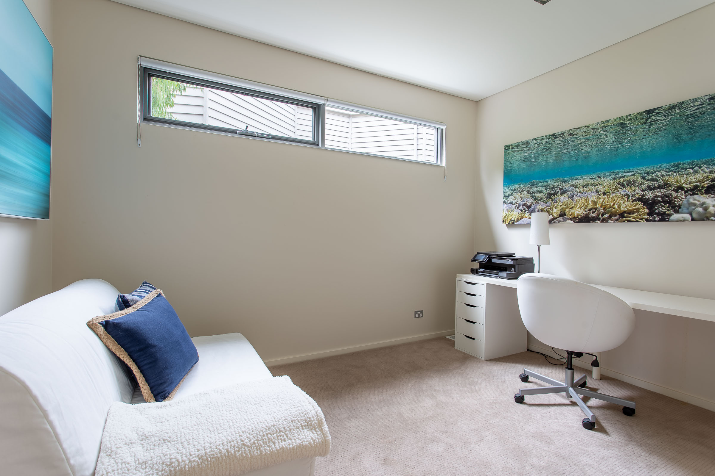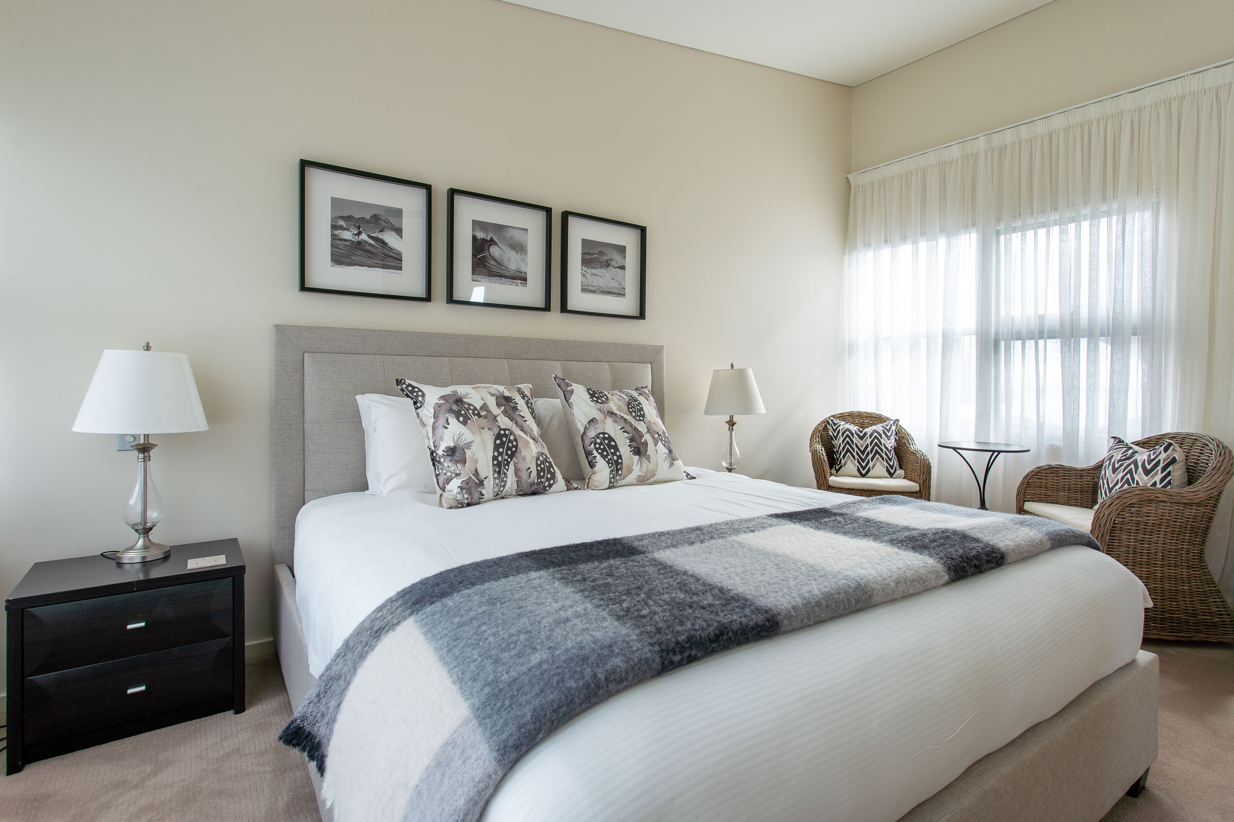 You’ll also appreciate the kitchen with its matt finish white cabinetry, subway tile splashback, and stone benchtop. The long island bench seats four and is perfect for conversations over giant mugs of tea as sea foam whips the coast outside. Afterwards, wander to the lounge room with its two large sofas with fluffy throw rugs and a collection of cushions. Coral in a glass, driftwood on the wall, and a big log fire – you’re going to love snuggling up with views straight out to the great outdoors.