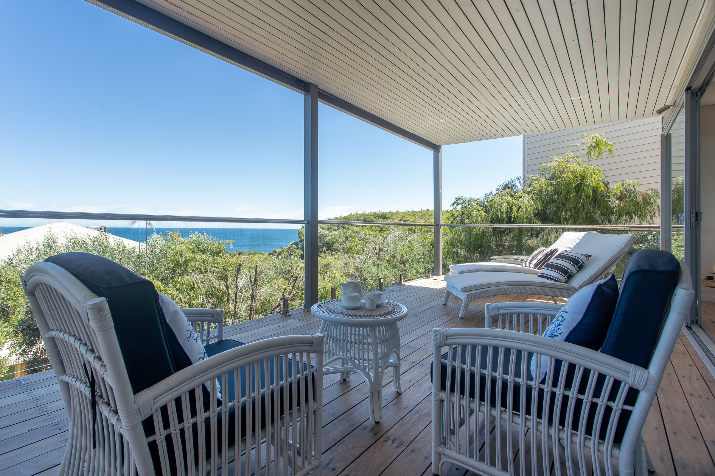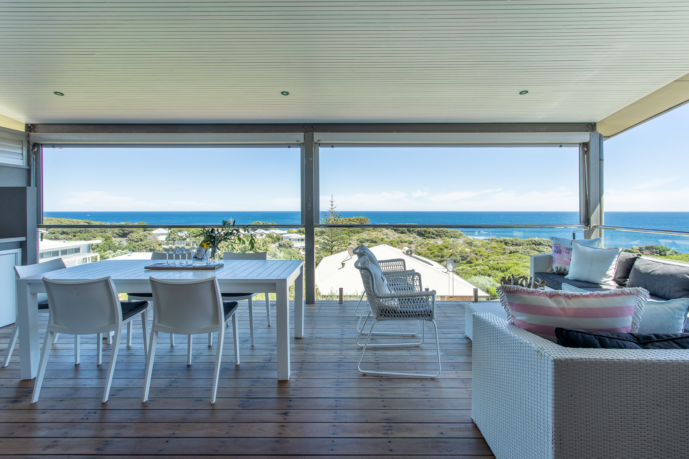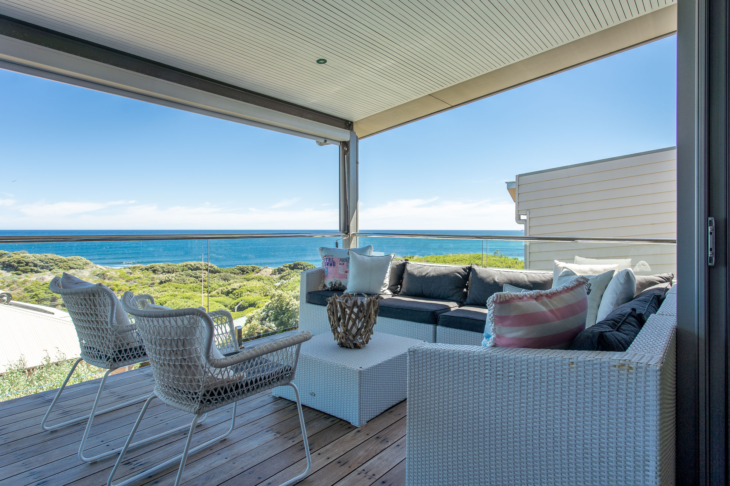 The master bedroom on the lower level feels exclusive with a private balcony and lounge area. This three-bedroom home is ideal for those who seek a comfortable ocean retreat with easy access to Caves House, the Lagoon café and leisurely ambles downhill to the swimming beach and iconic surf breaks.