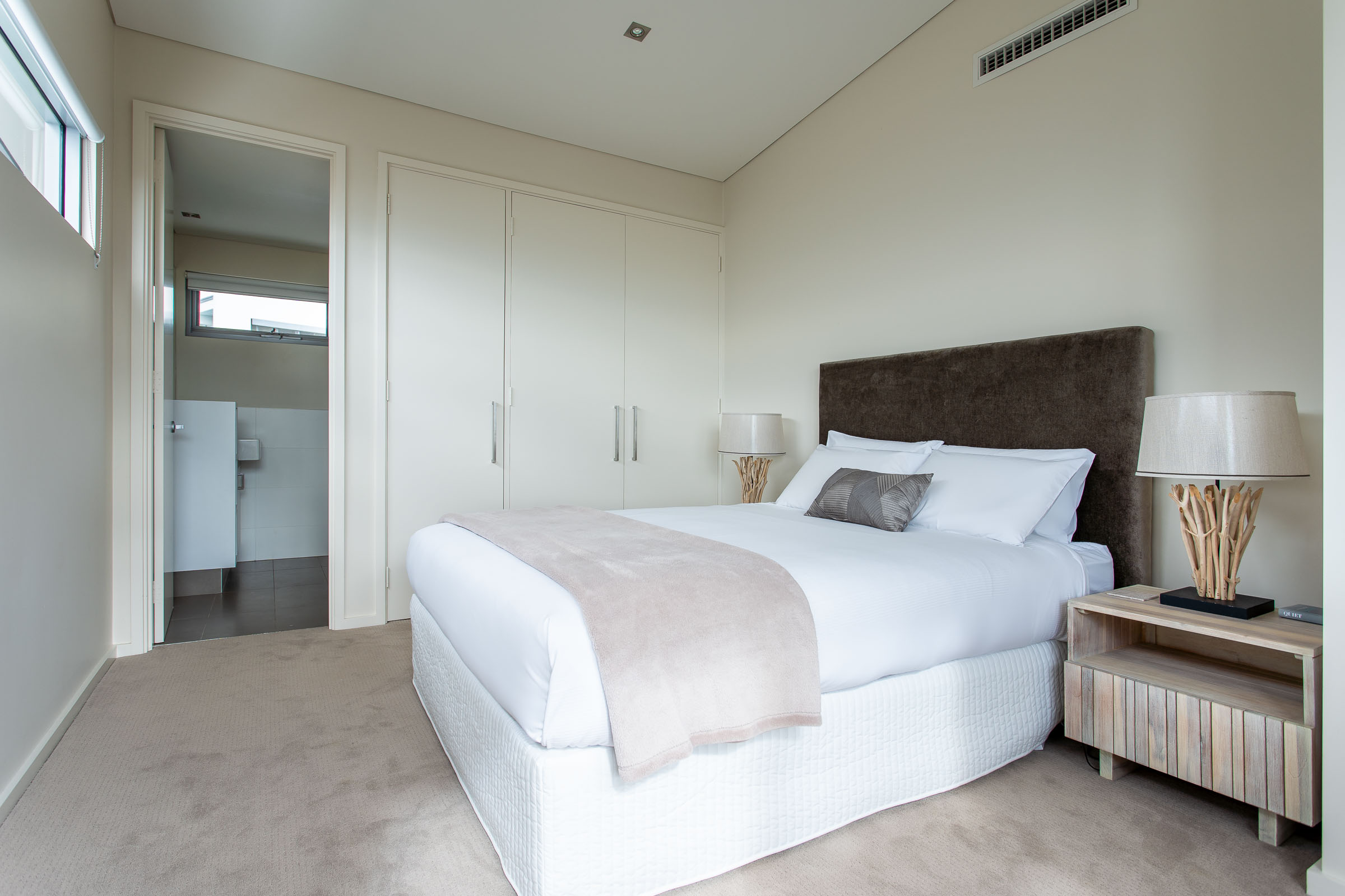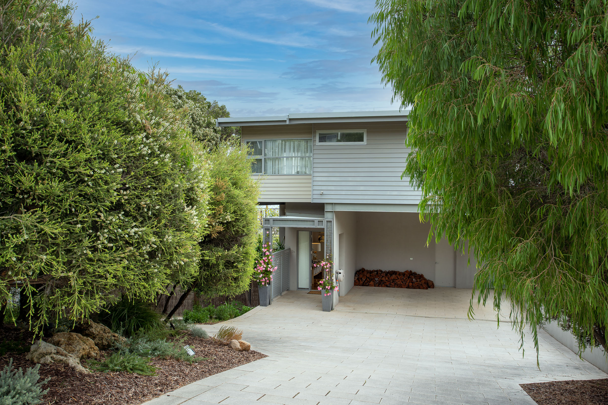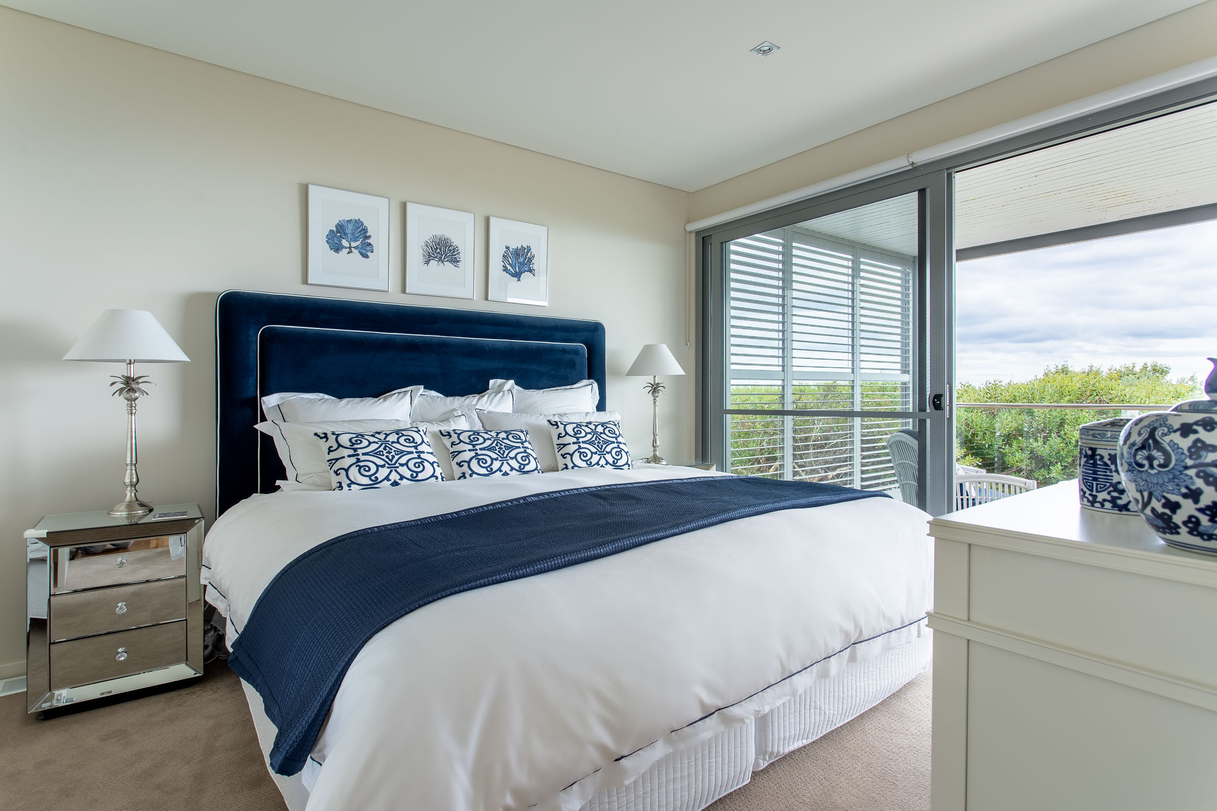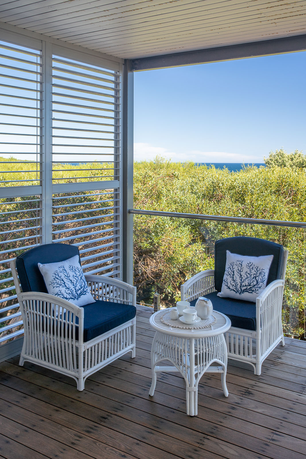 The master bedroom on the lower level feels exclusive with a private balcony and lounge area. This three-bedroom home is ideal for those who seek a comfortable ocean retreat with easy access to Caves House, the Lagoon café and leisurely ambles downhill to the swimming beach and iconic surf breaks.
