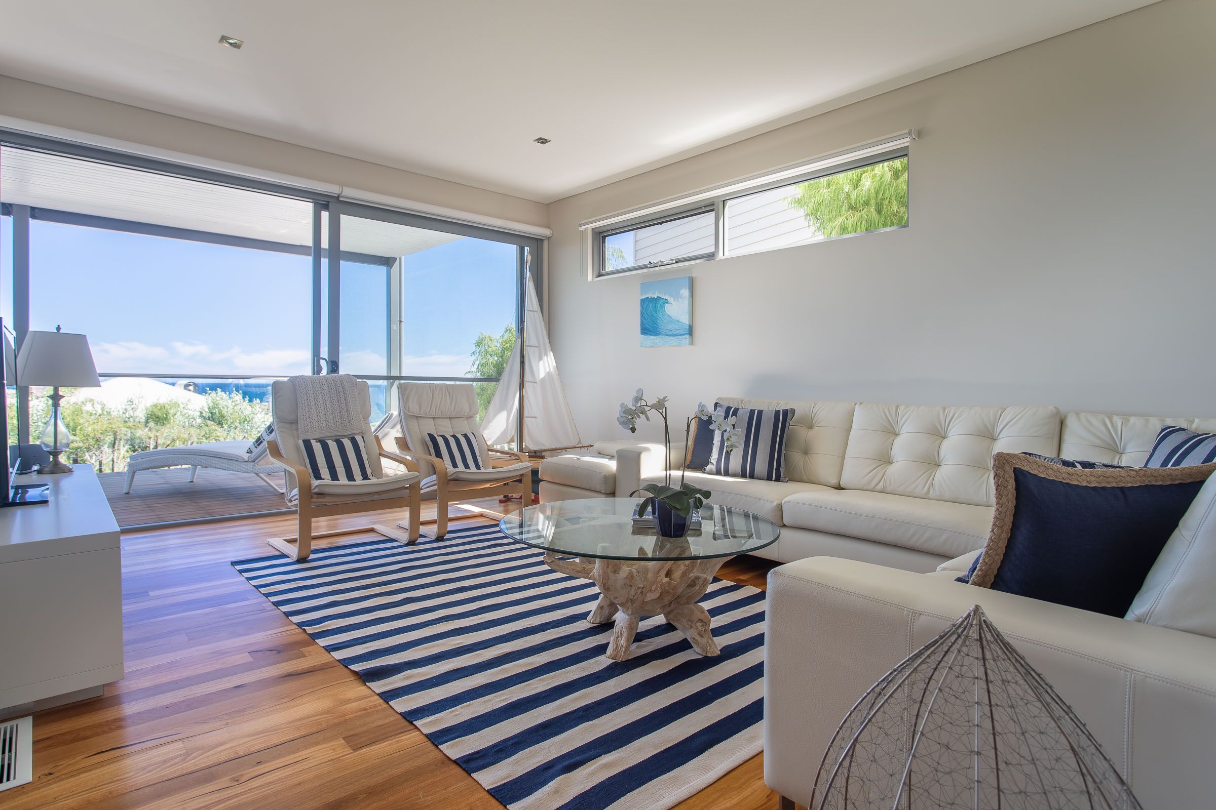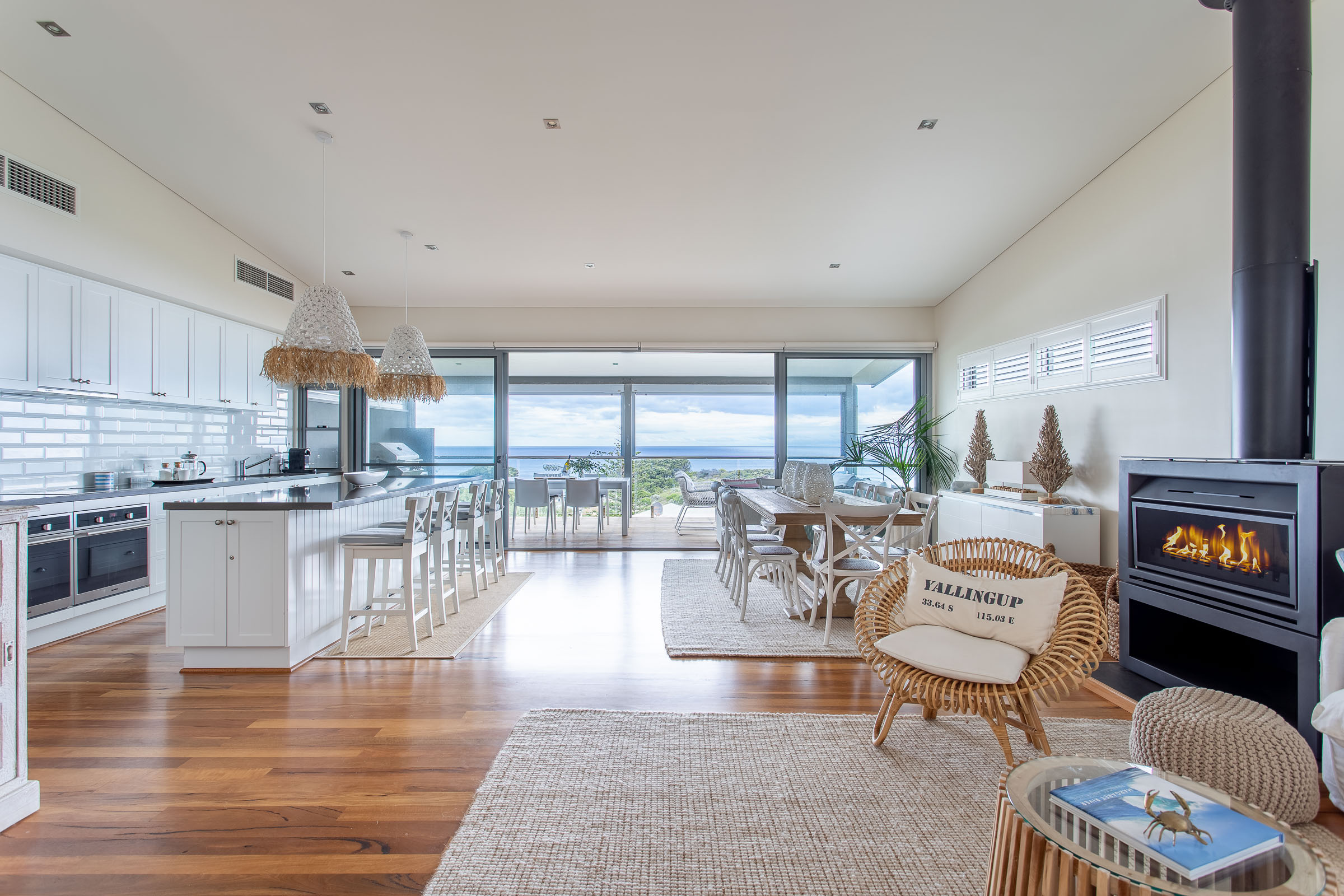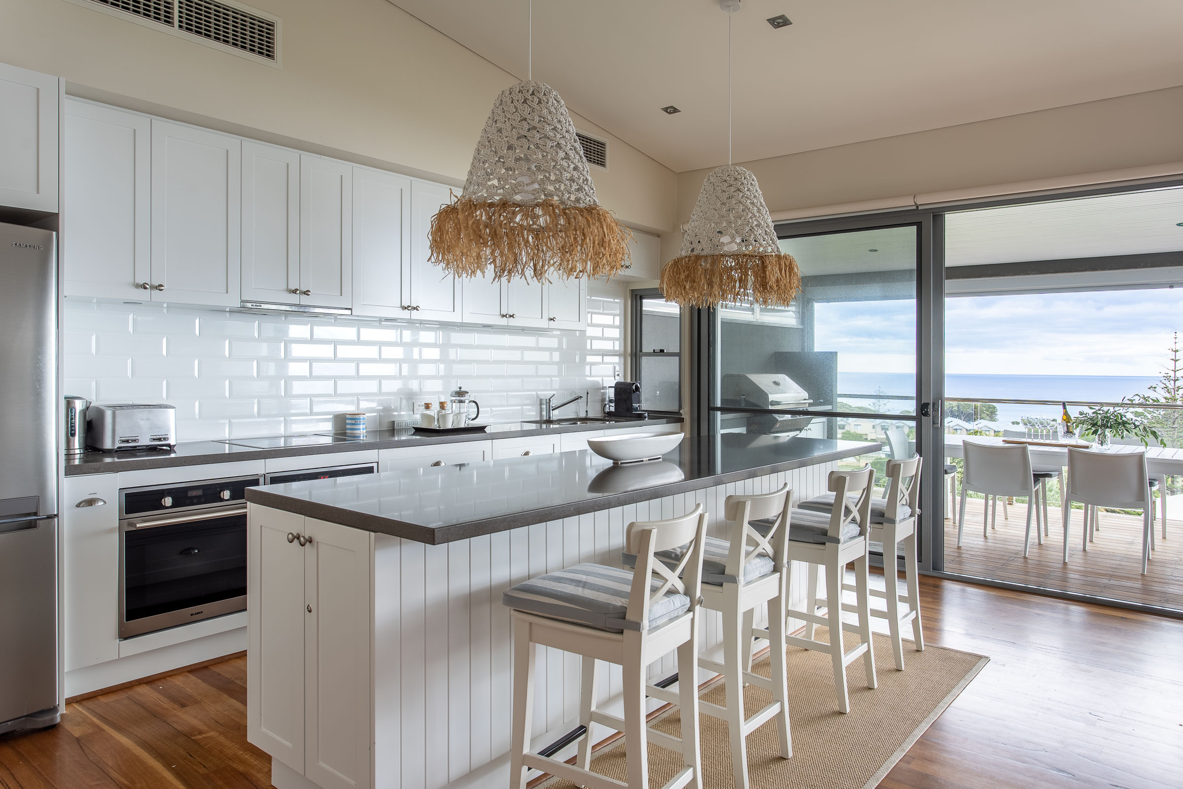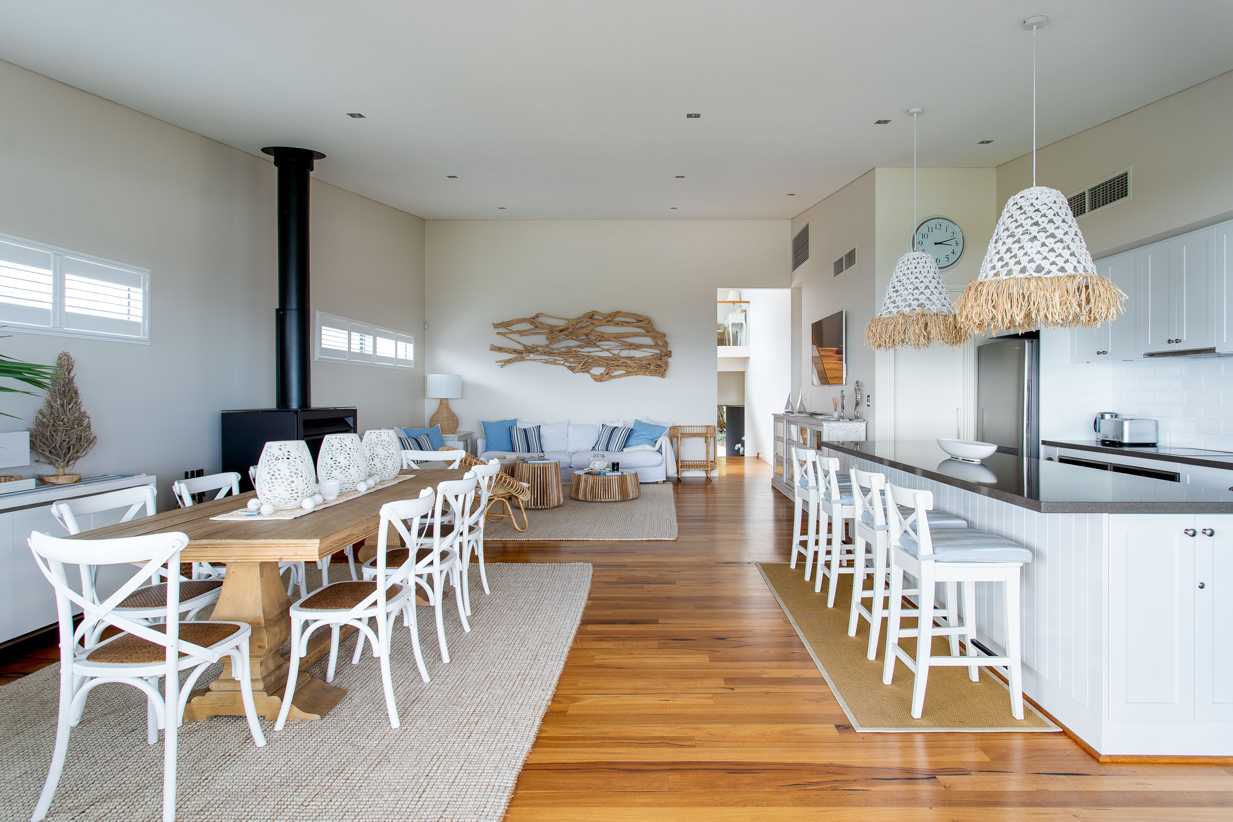 Inside, there's a very calm, holiday vibe, with hues of crisp white and ocean blue, and the textured coastal chic lampshades and kitchen pendant lights are a relaxed boho touch. The warm timber flooring throughout brings it all together in one graceful swoop.