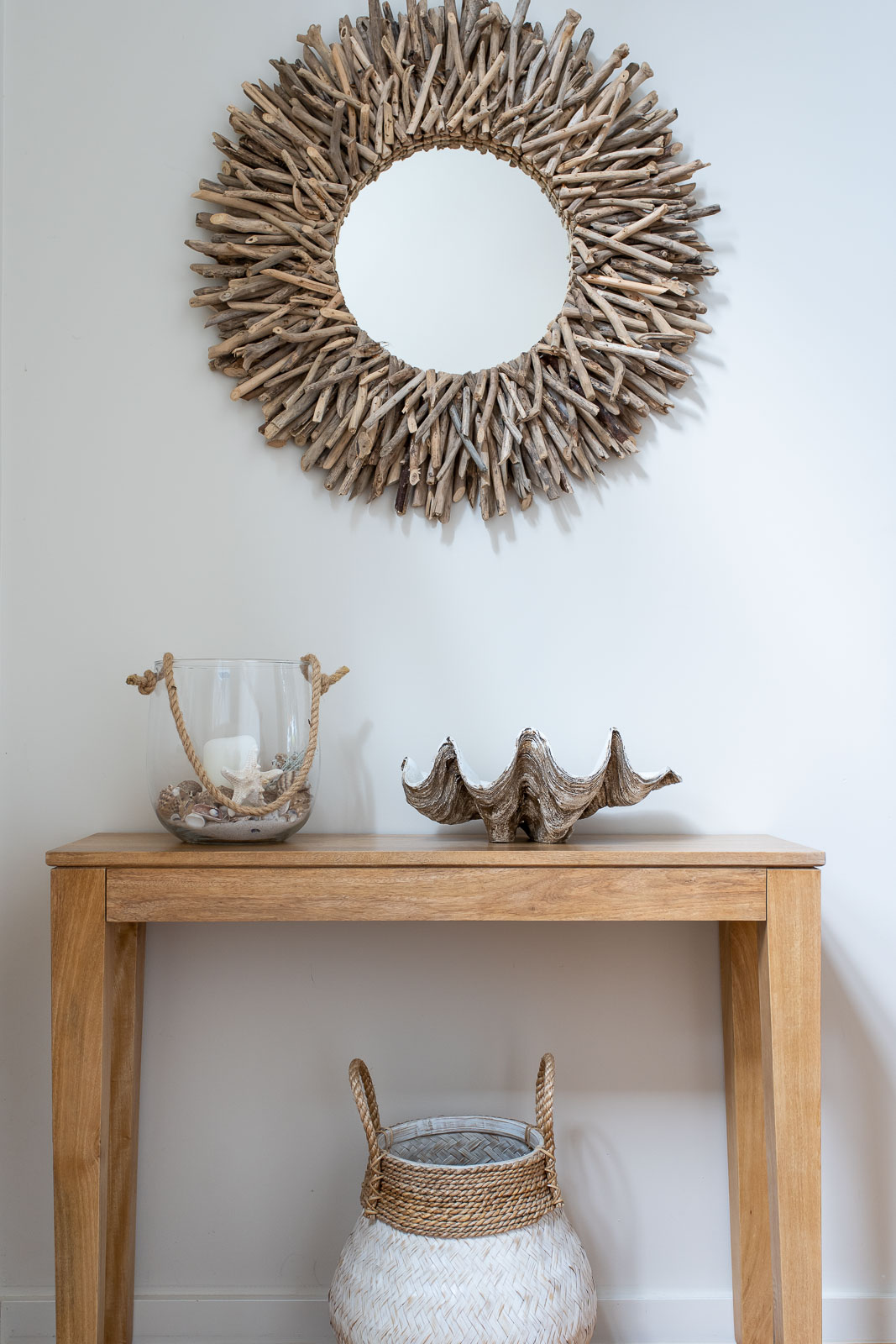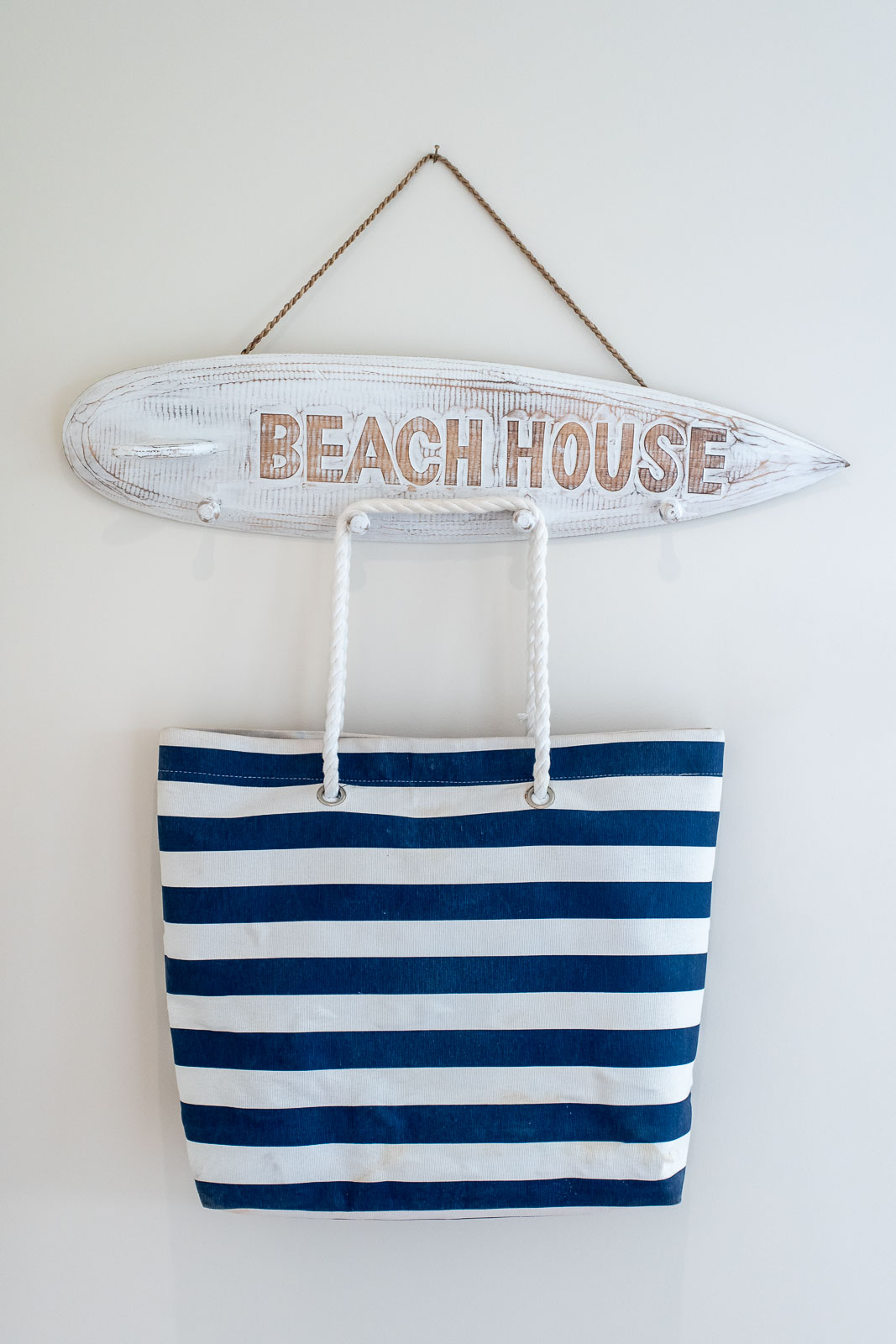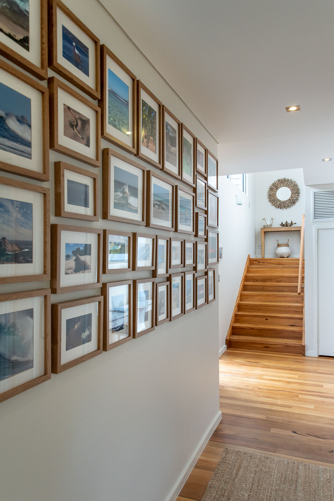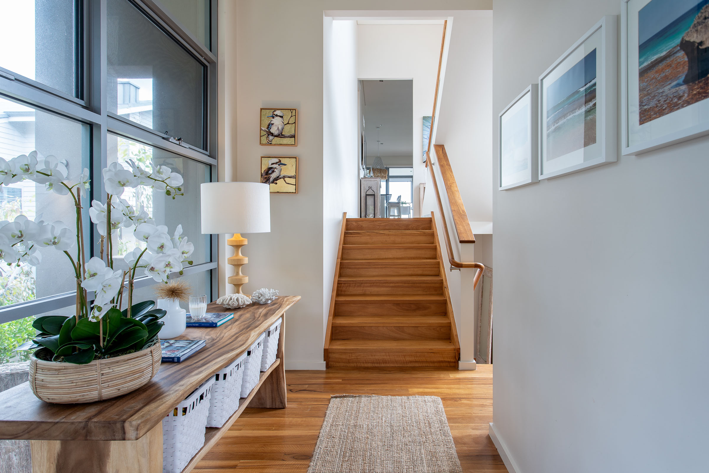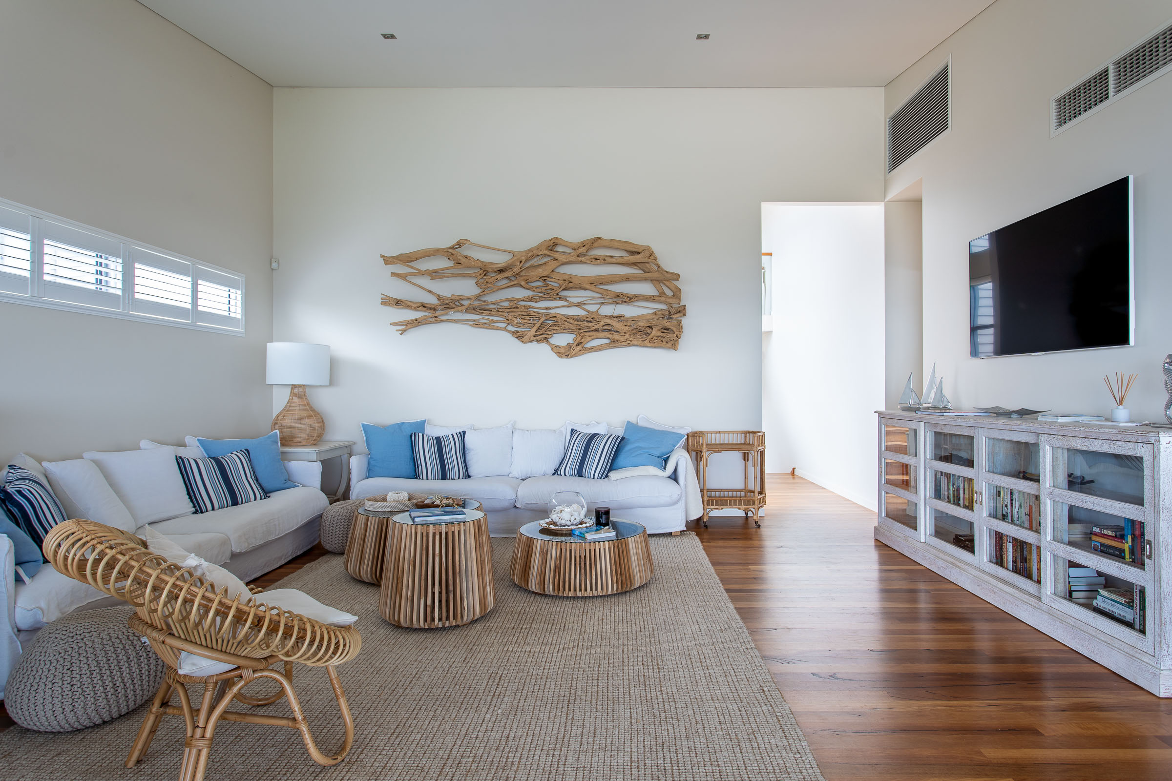 Inside, there's a very calm, holiday vibe, with hues of crisp white and ocean blue, and the textured coastal chic lampshades and kitchen pendant lights are a relaxed boho touch. The warm timber flooring throughout brings it all together in one graceful swoop.