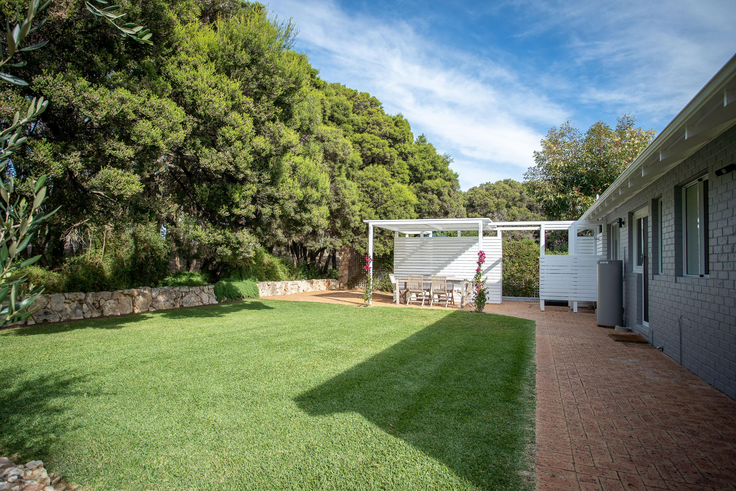 The back garden looks onto native bushland and has a patio dining area and another lawn area.