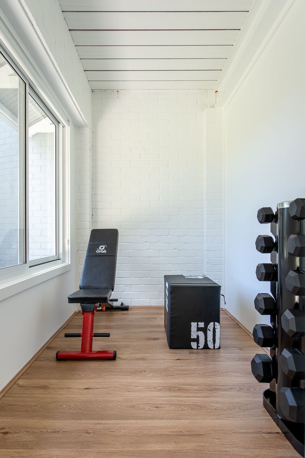 A second living area downstairs, perfect for children with TV and table tennis table, opens onto the enclosed large front lawn. The small gymnasium is also on this level.