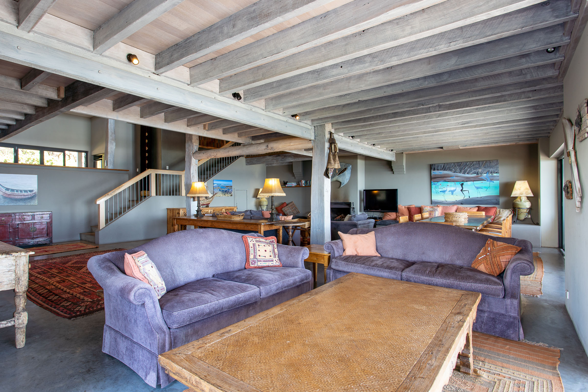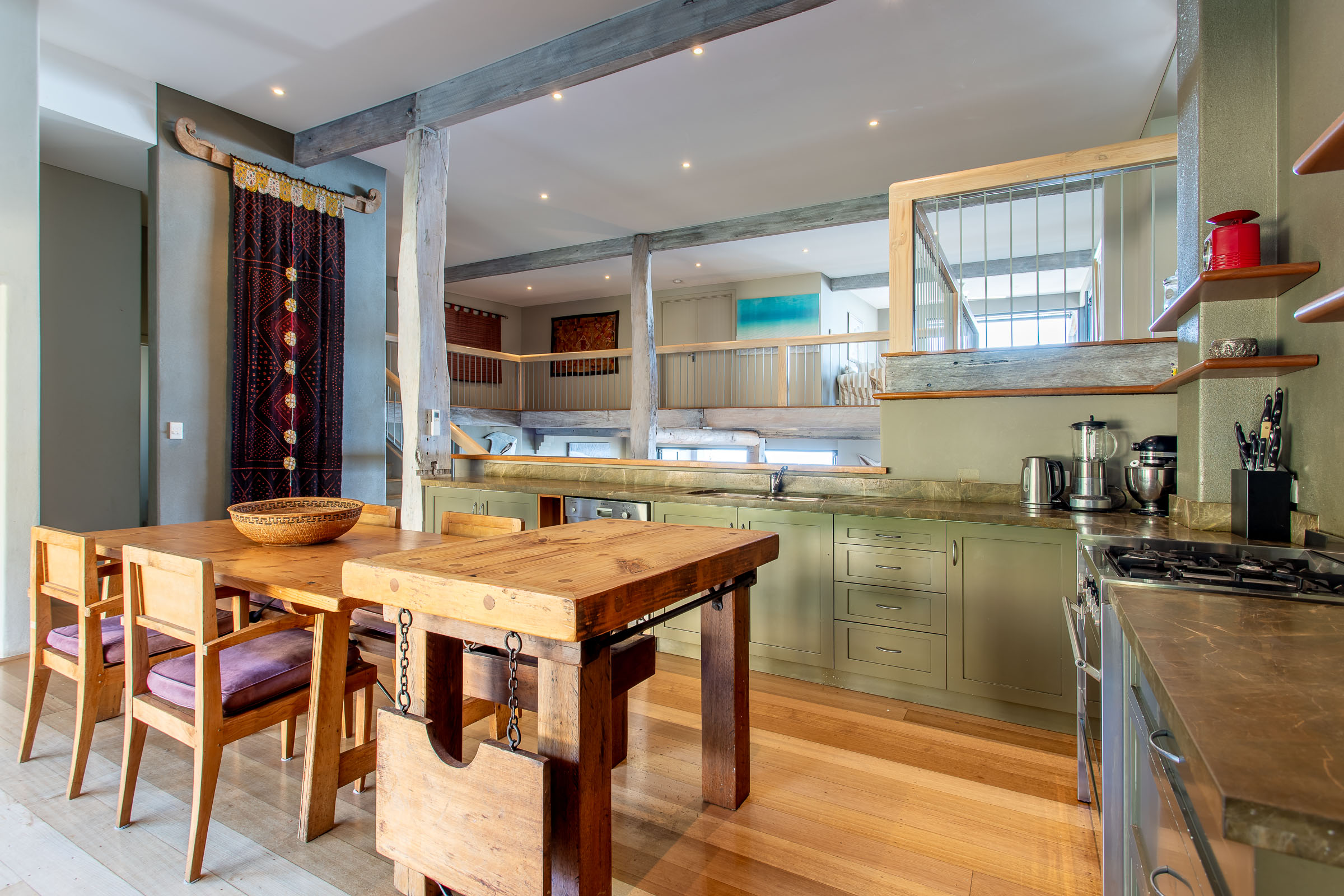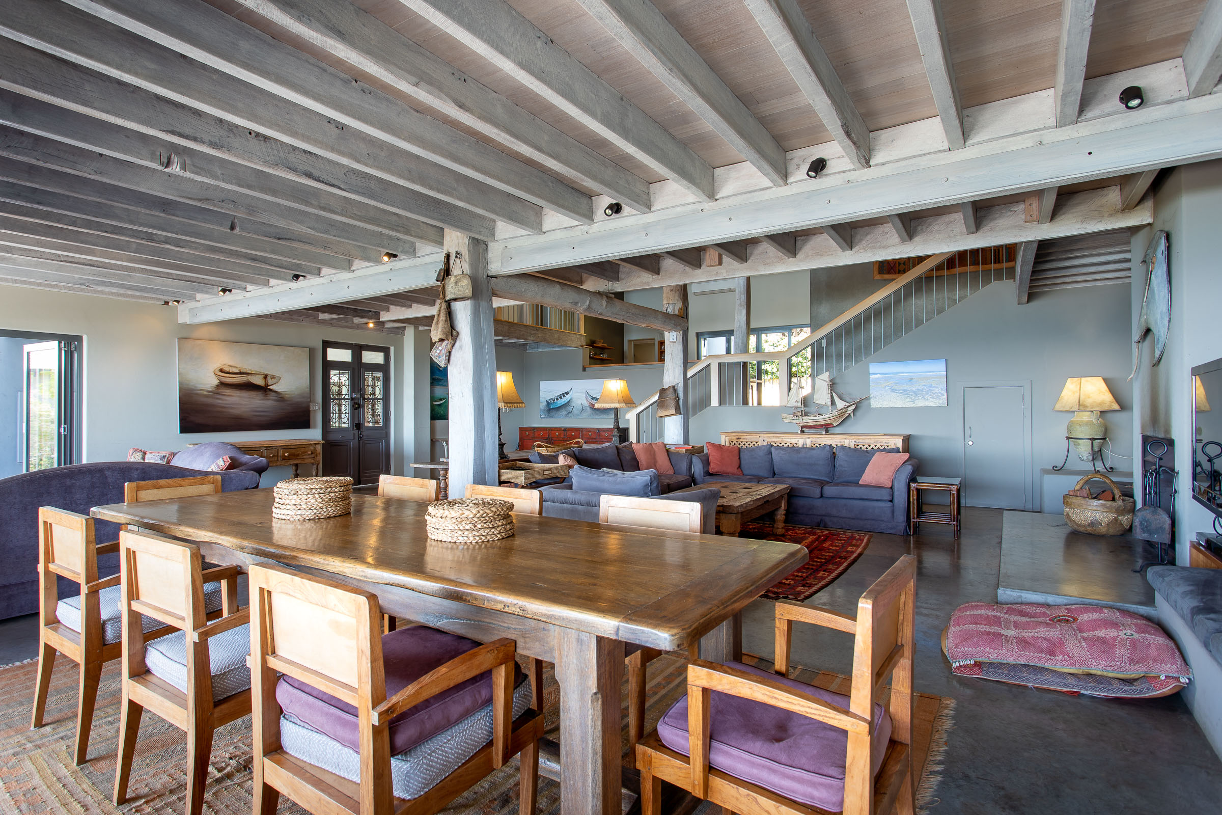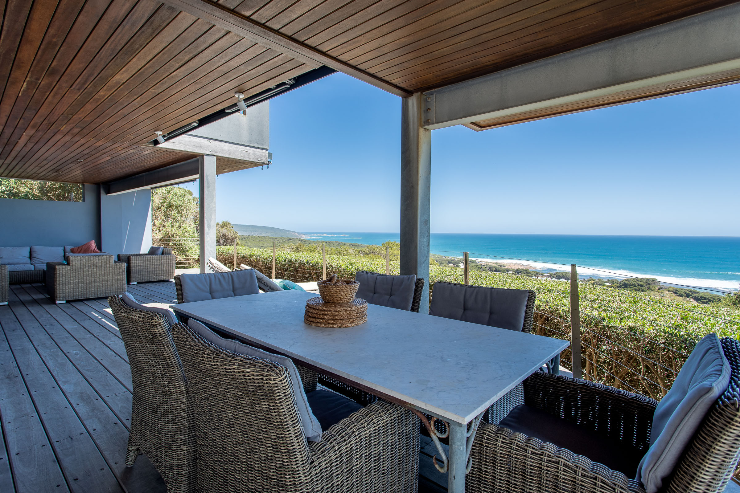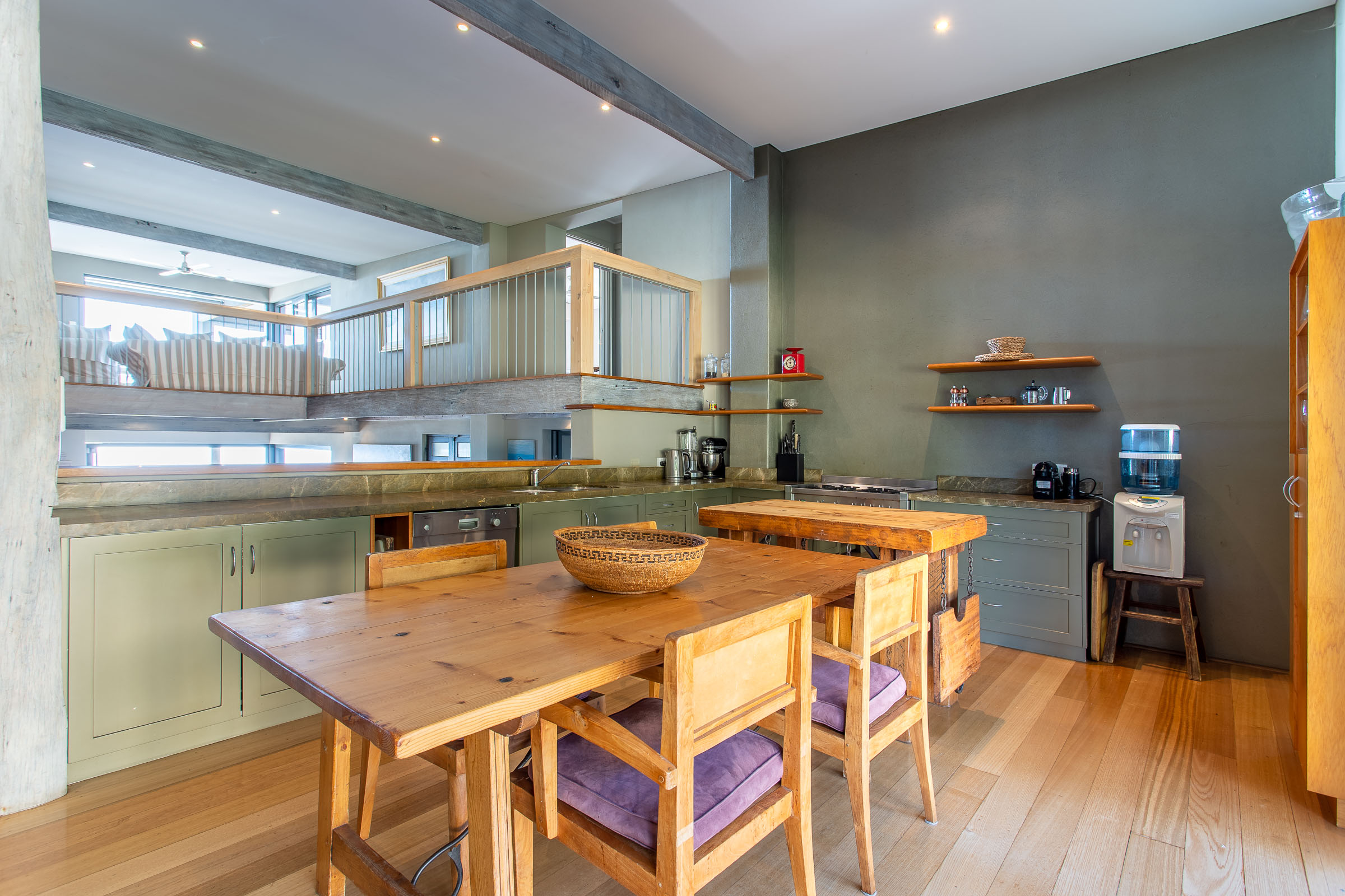 Perched high on Yallingup hill, The Lookout boasts a 180-degree panorama from Cape Naturaliste in the north to Canal Rocks in the south. There’s character in this home; a unique combination of cosy lodge and airy coastal retreat. On the one hand, there are exposed wood beams, a big collection of comfortable sofas, rugs in deep red and burnt orange, and a wood fire ready to crackle away. On the other, you have high ceilings, huge doors, and charming pops of nautical décor and beachy artwork which adds to the coastal ambience.