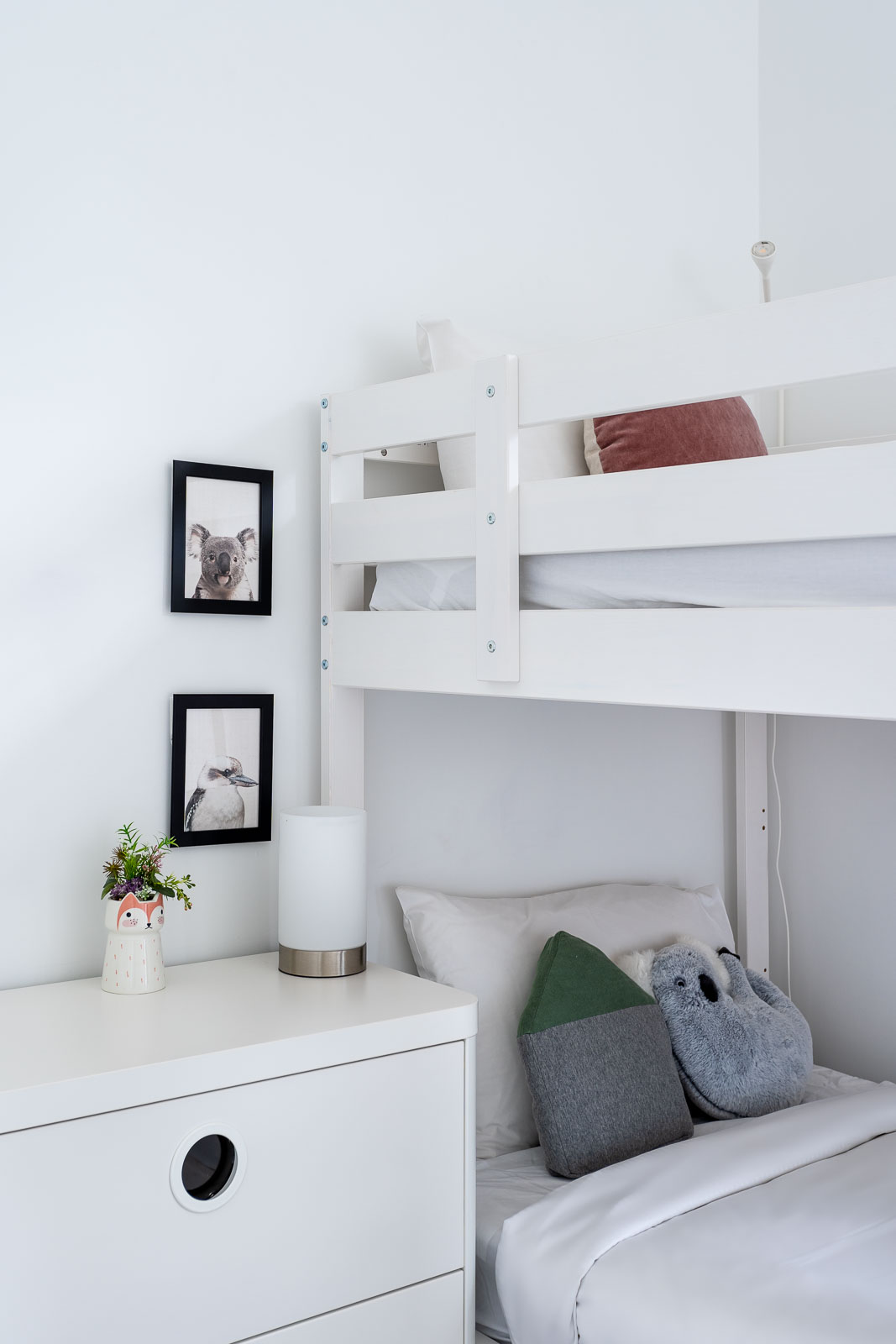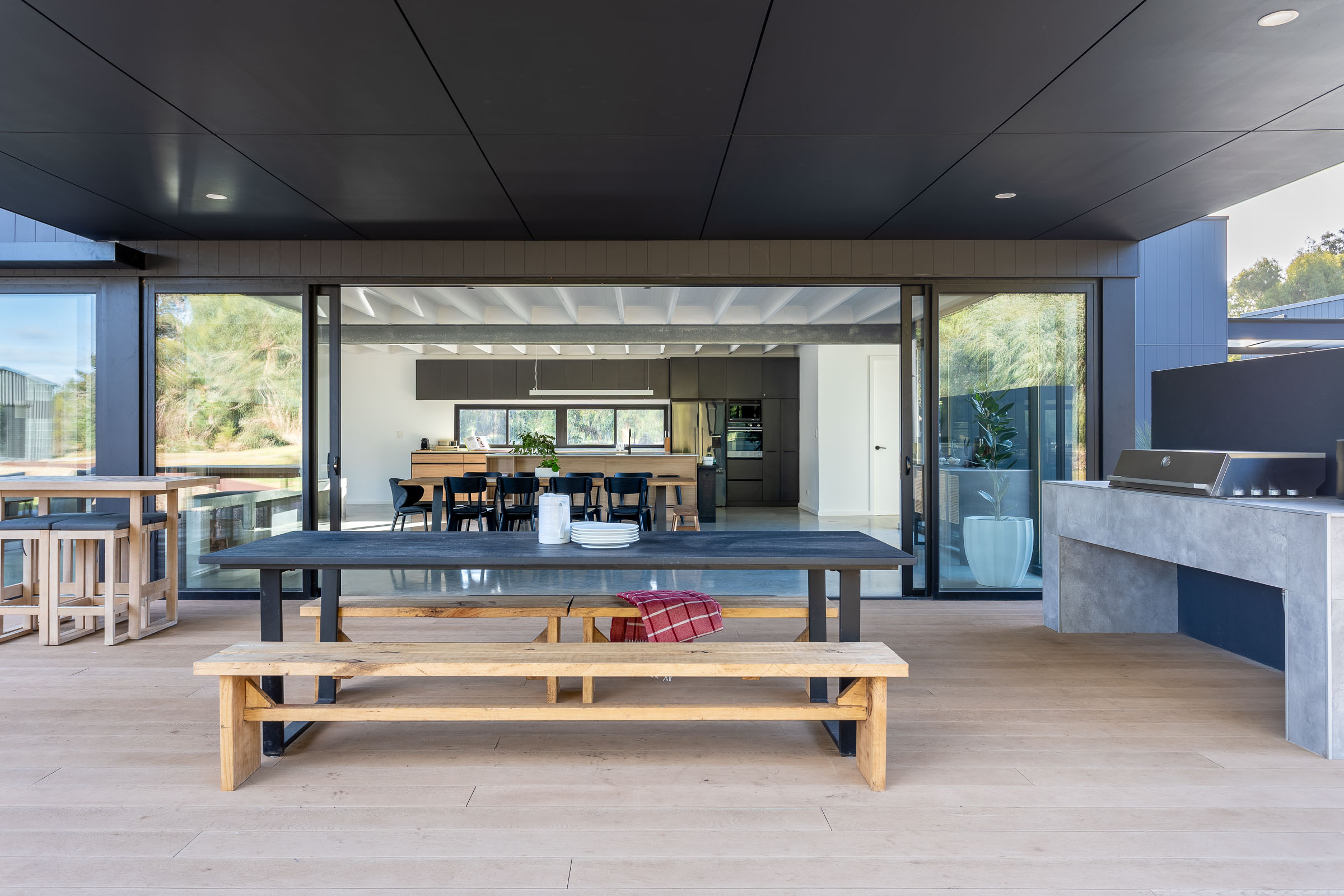 Clean and crisp interiors soak in light, thanks to floor-to-ceiling glass panels, windows and doors, while wooden details add a touch of warmth throughout. The main living space connects seamlessly to an outdoor deck and barbecue via sliding glass doors, which, when open, let in a fresh breeze that drifts effortlessly through the home.