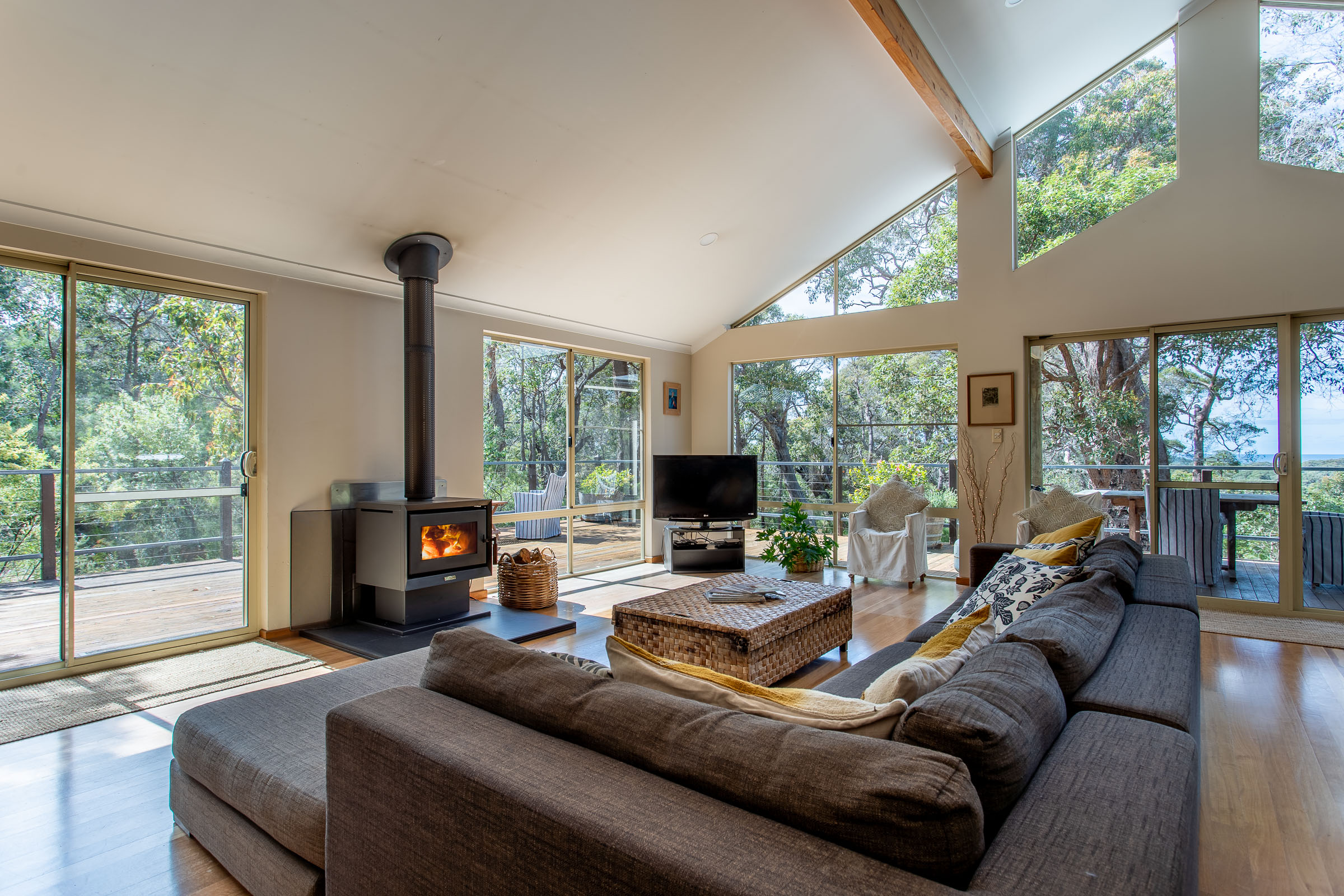 The house sits high up surrounded by trees giving you the feeling of nestling amongst the branches with stunning elevated views to the inlet and Southern Ocean. Look over the sprawling five acres of bush and you will surely spot some Spring wildflowers and native animals, including kangaroos and birds.