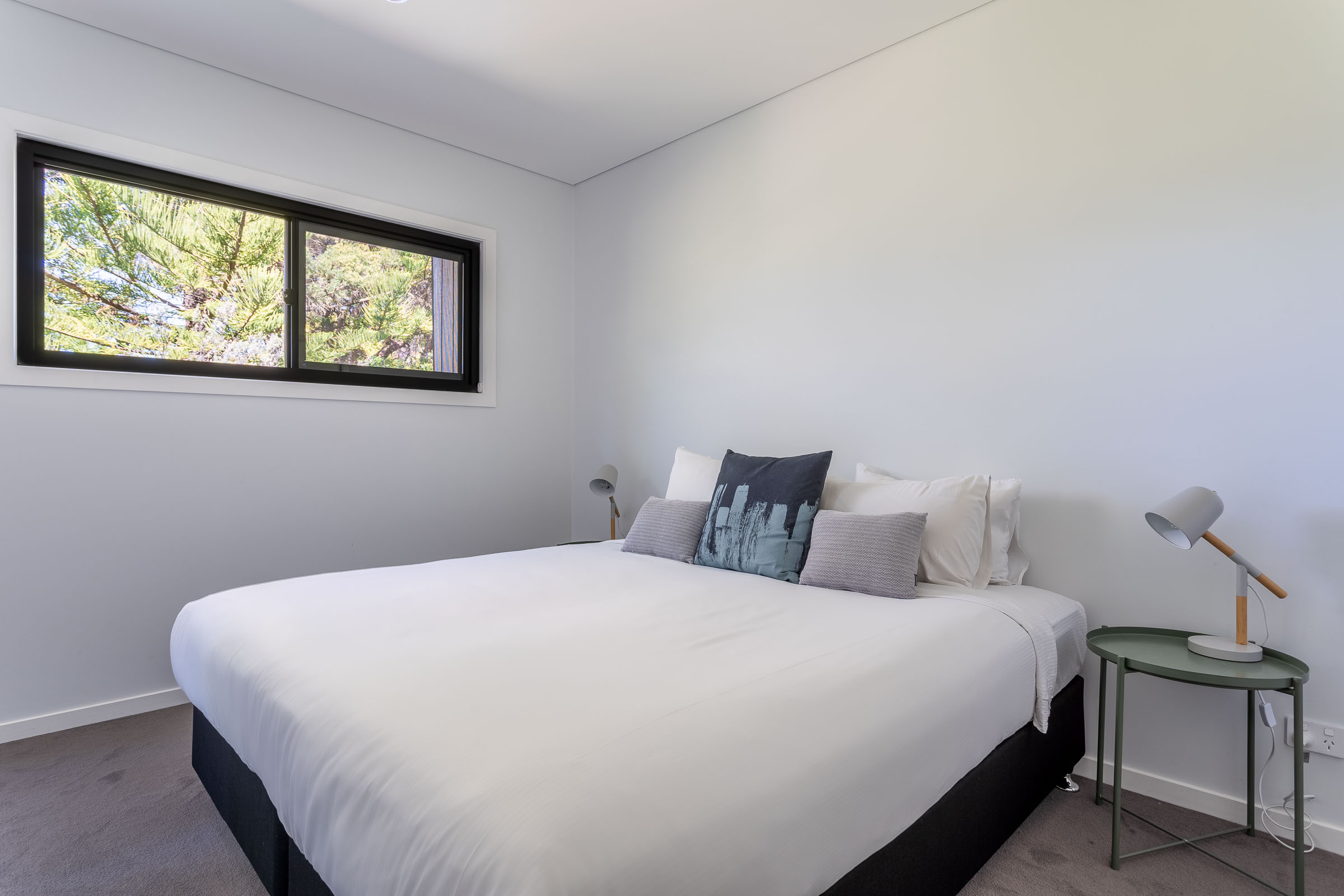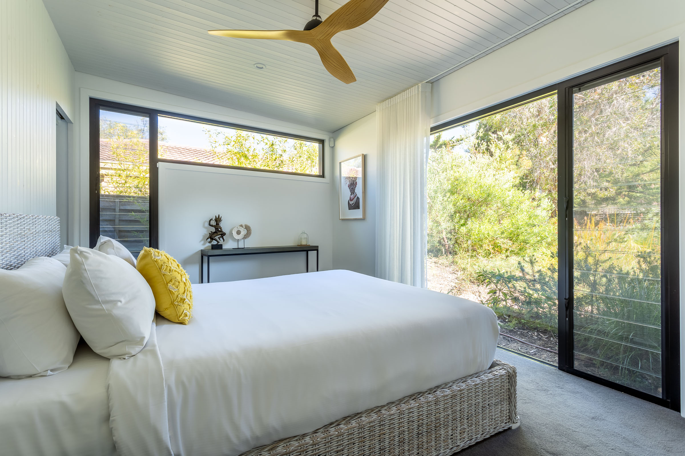 Woody Nook’s L-shaped layout lets guests embrace nature from almost every room. The main living area, enclosed by floor-to-ceiling glass windows and doors, opens up on either side to allow guests direct access to both the front lawn and the back garden – a central courtyard filled with native plants and trees.