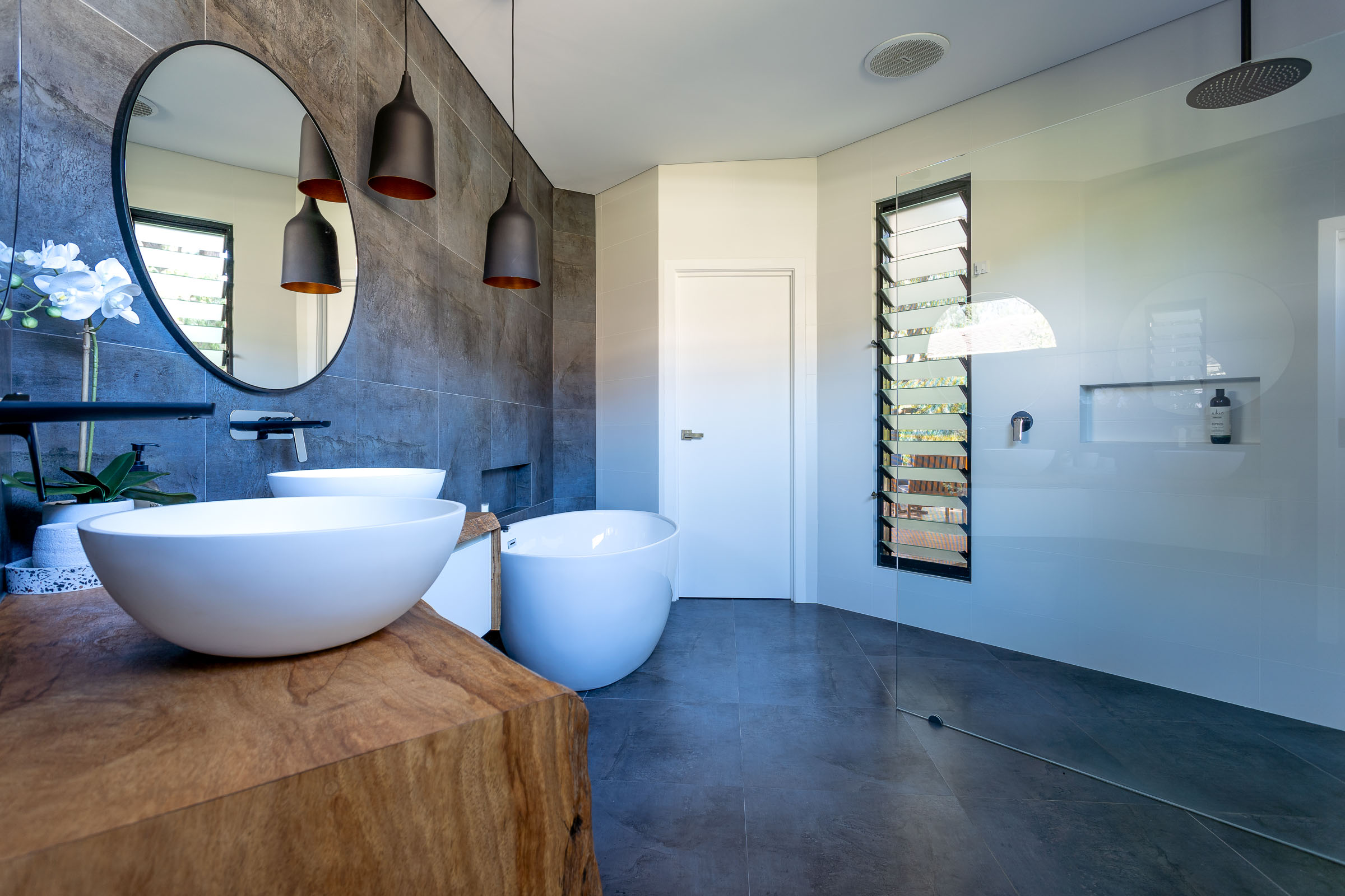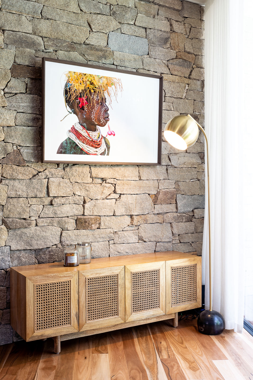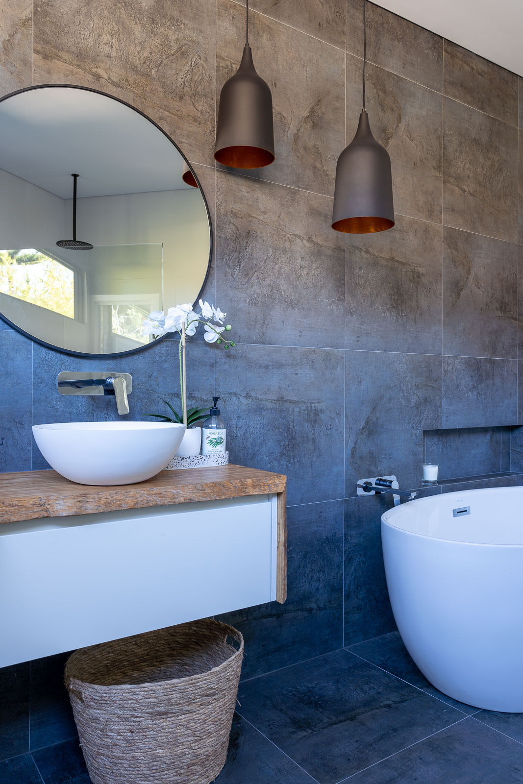 Guests can also access the courtyard, complete with trickling creek and a pleasant, tree-canopied sitting area, via the bedroom and TV room wing. Front and back alfrescos show off the home’s timber panelled exterior, which is complemented by an interior of polished wooden floors, rugged stone and crisp white walls.